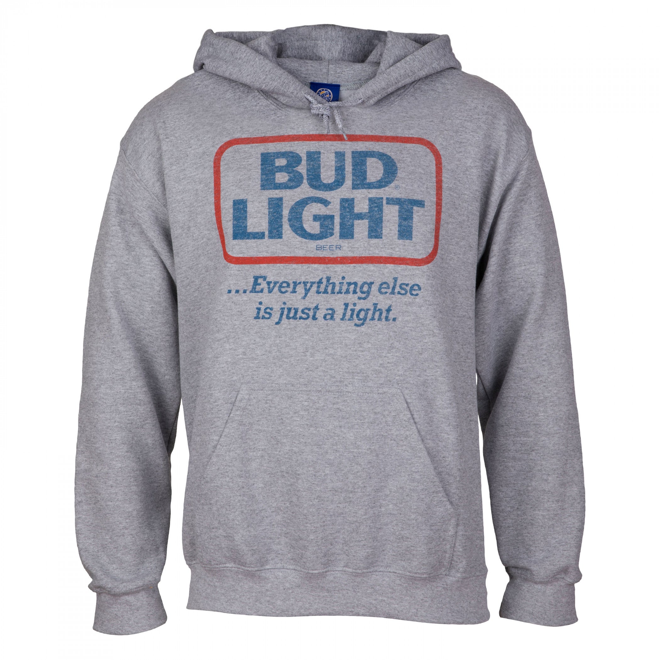 Officially licensed Bud Light Everything Else is Just a Light Pull-Over Hoodie. This grey "Bud Light" pullover hoodie is made from cotton and features the classic "Bud Light" Everything Else is Just a Light logo printed on the front.