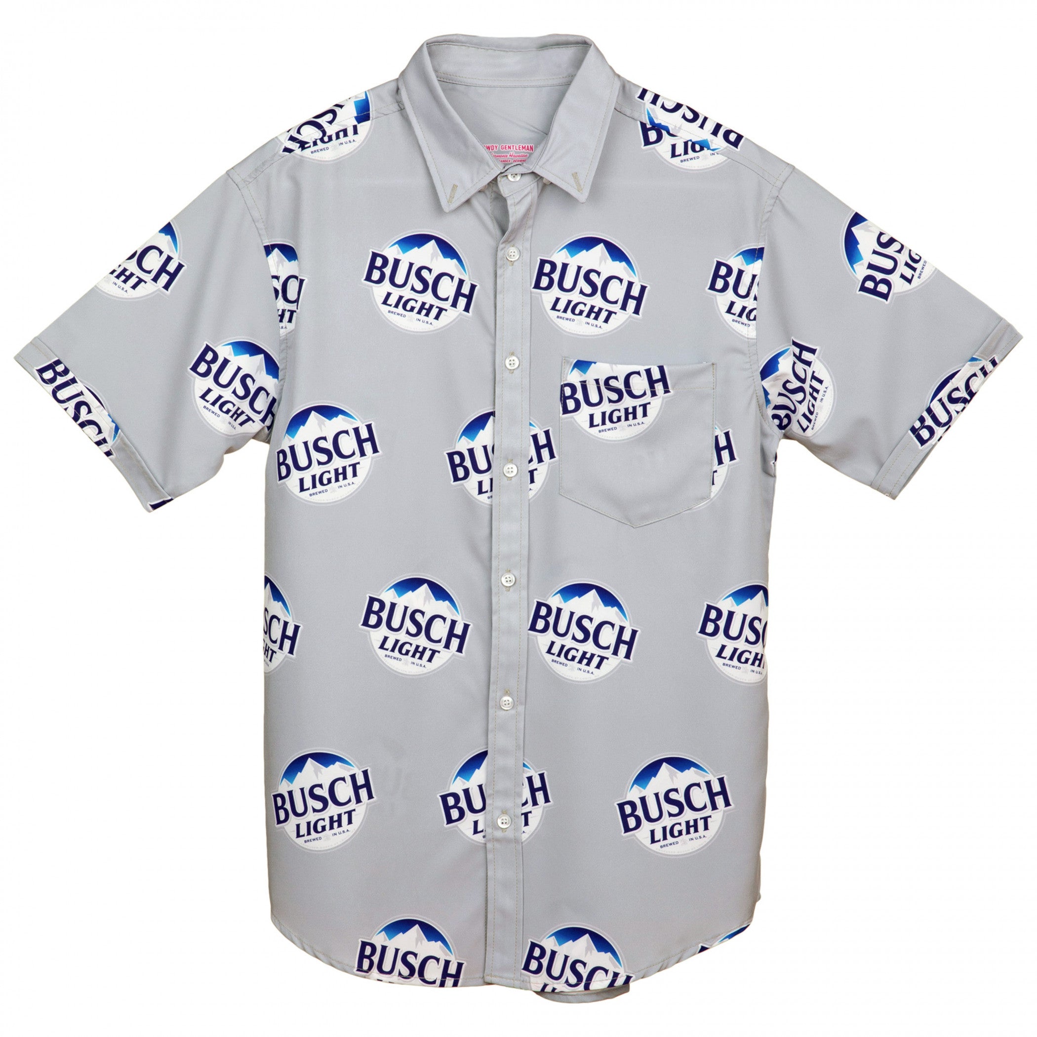 Officially licensed Busch Light All Over Print Button Down Hawaiian Shirt. This grey "Busch Light" Button Down Hawaiian Shirt is made from polyester and features a classic "Busch Light" logo all-over print design.