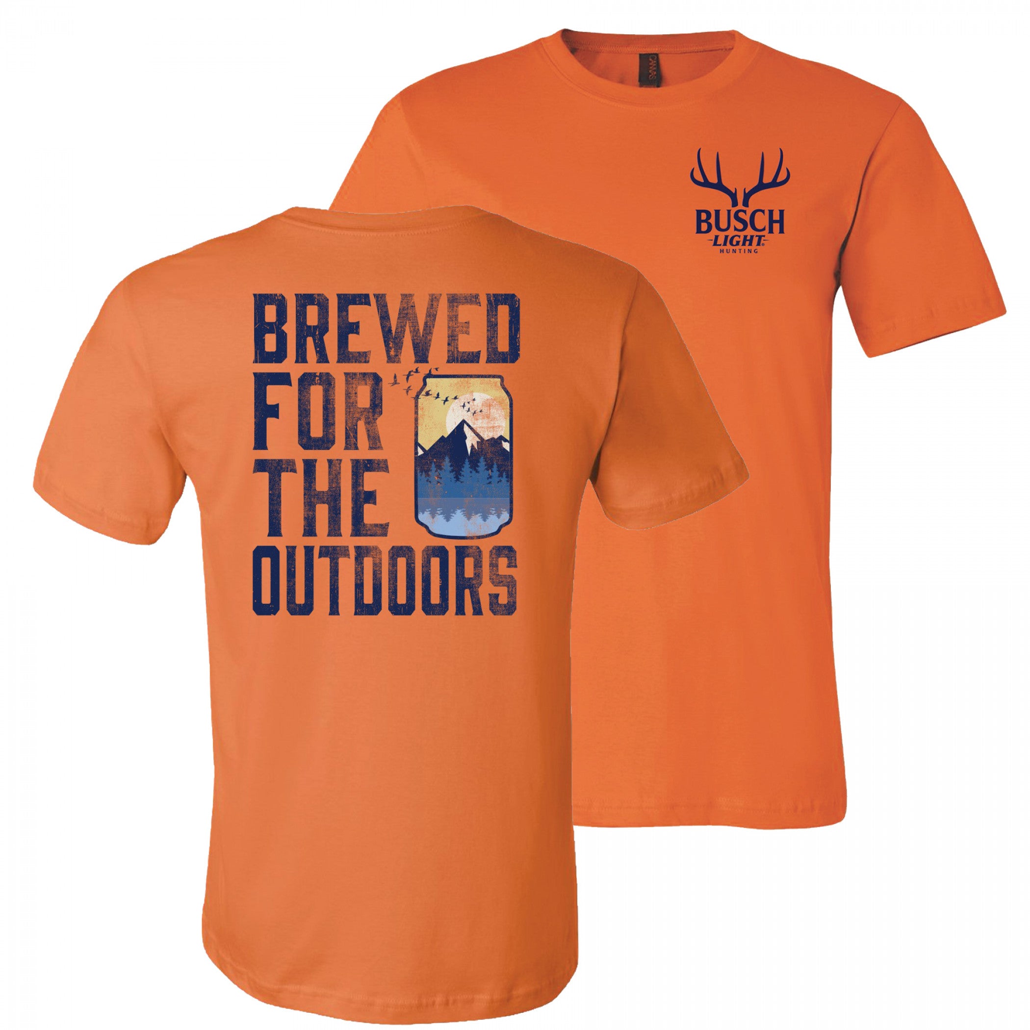 Officially licensed Busch Light Beer Brewed For The Outdoors Front and Back Print T-Shirt. Made from cotton, this orange "Busch Light Beer" t-shirt features a classic "Busch Light Beer Brewed For The Outdoors" front and back print design.