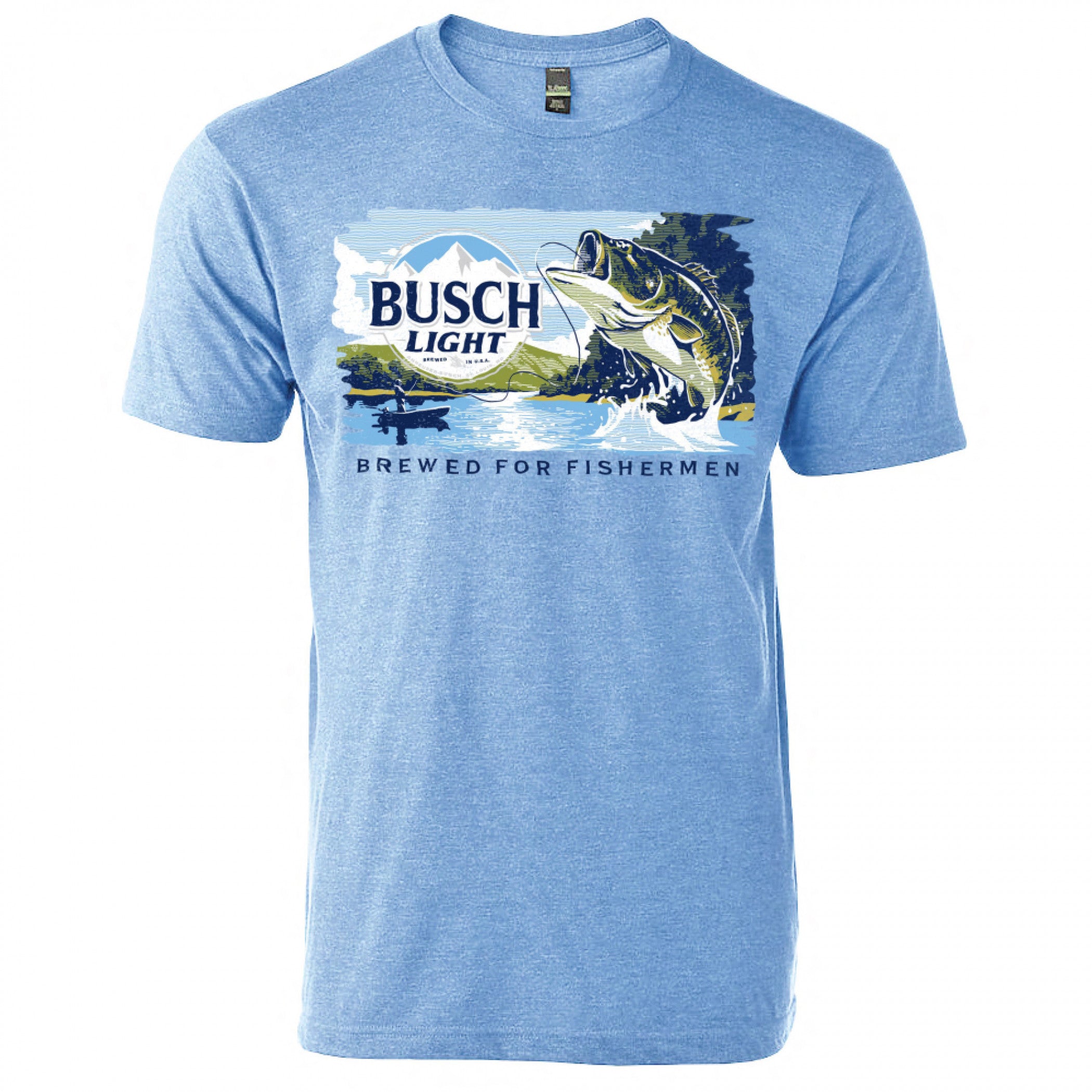 Officially licensed Busch Light Brewed For Fishermen Blue Colorway T-Shirt. This "Busch Light" Blue Colorway T-Shirt is made from cotton and features a classic "Busch Light Brewed For Fishermen" graphic on the front.