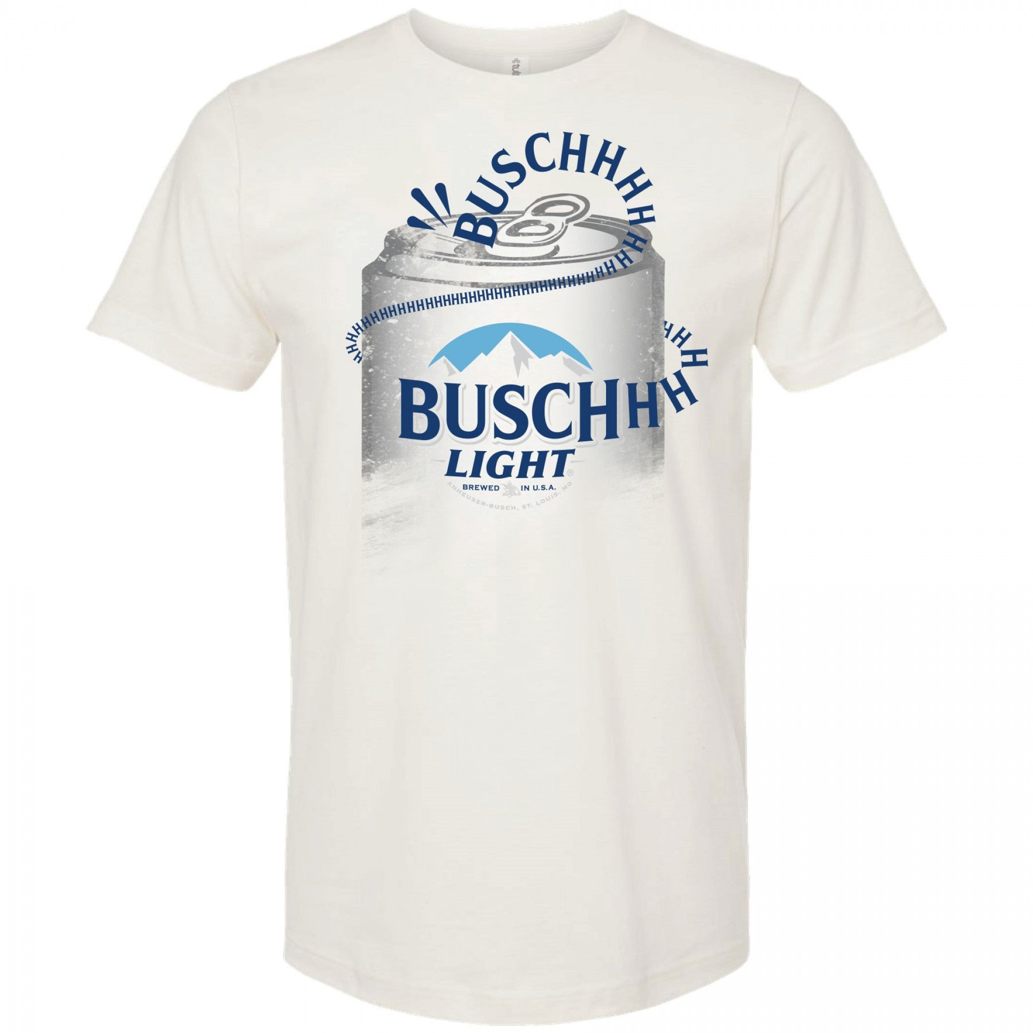 Officially licensed Busch Light Buschhhhhhhh Blue Colorway T-Shirt. This white "Busch Light Beer" t-shirt is made from cotton and features a classic "Busch Light Buschhhhhhhh" can logo design on the front.