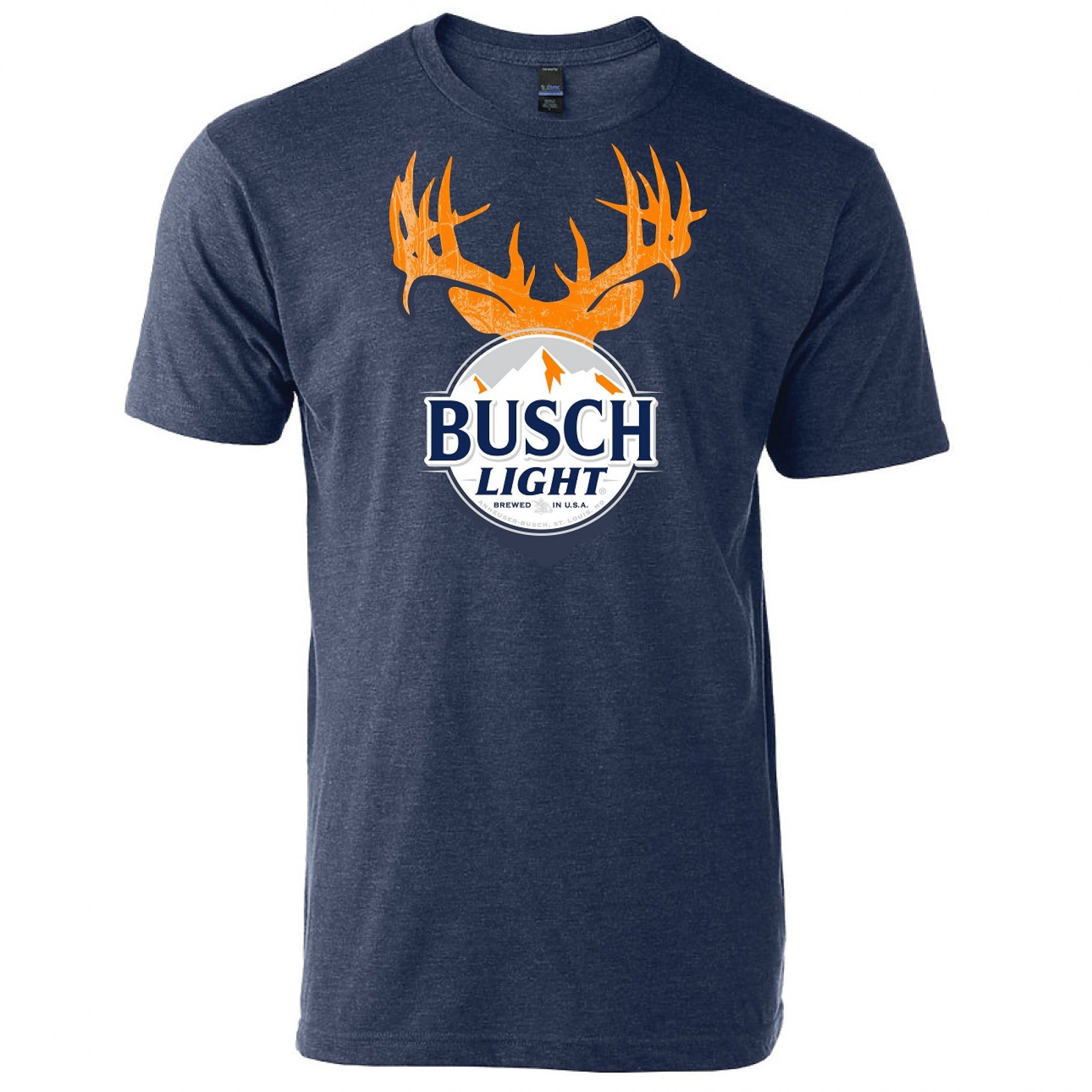 Officially licensed Busch Light Hunter Orange Buck Horns T-Shirt. Made from a cotton/poly blend, this blue t-shirt features the "Busch Light" logo and orange buck horns design.