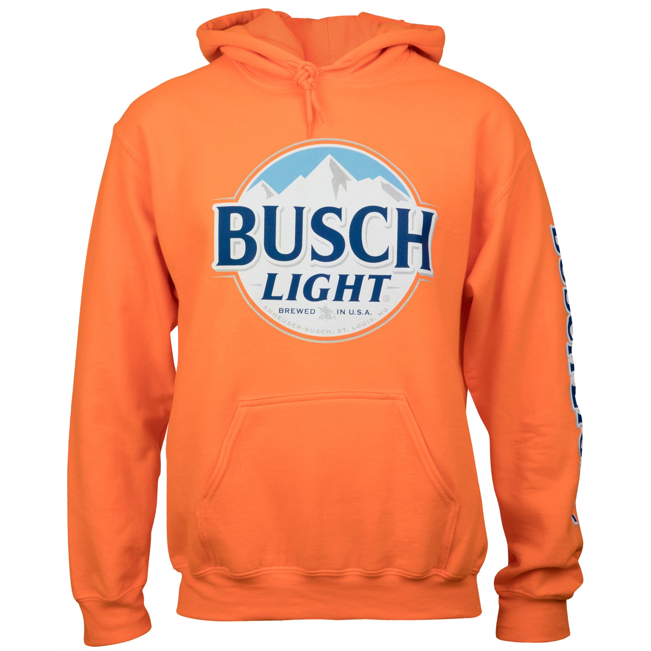 Officially licensed Busch Light Hunter Orange Hoodie. Made from a cotton/poly blend, this orange pullover hoodie features the authentic "Busch Light" logo on the front and "Buschhhh" printed on the sleeve.