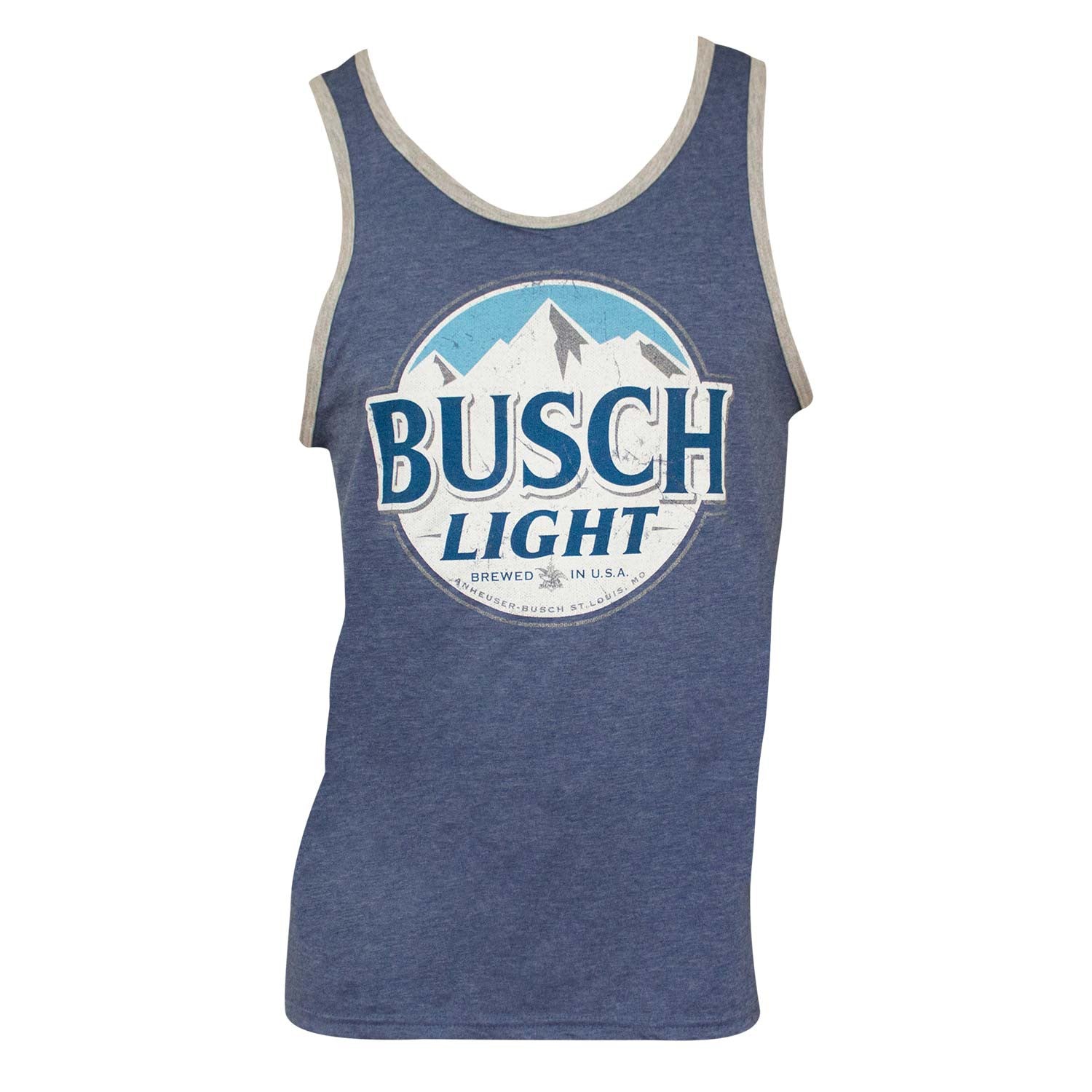 Authentic Busch Light tank top for men. Features the beer's logo in a distressed style on the front. Comes in heather blue with gray trim and is made of a cotton/poly blend.