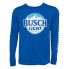 Men's blue Busch Light long sleeve t-shirt. Made from 100% cotton, this tee features the "Busch Light" logo on the front with "Buschhhhhhh" printed on the left sleeve. Officially licensed.