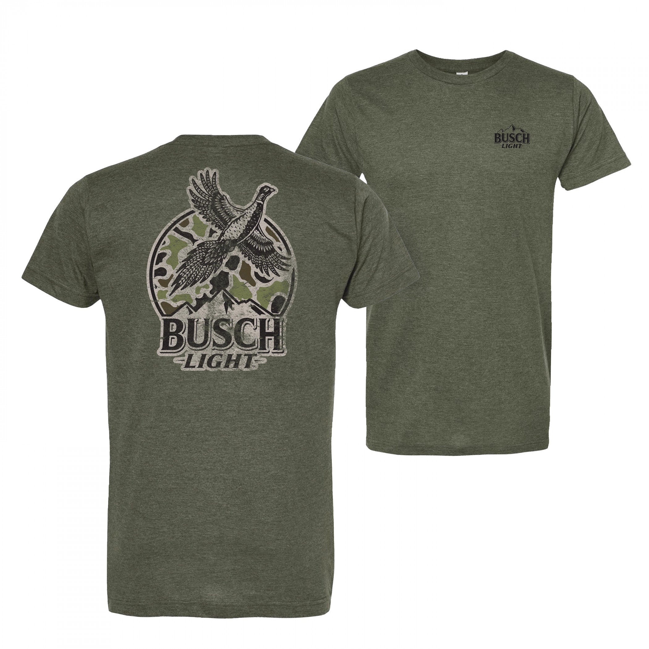 Officially licensed Busch Light Pheasant Hunting Camo Logo Forest Green T-Shirt. This forest green "Busch Light" t-shirt is made from cotton and features a "Busch Light Pheasant Hunting" camouflage logo design printed on the front and back.