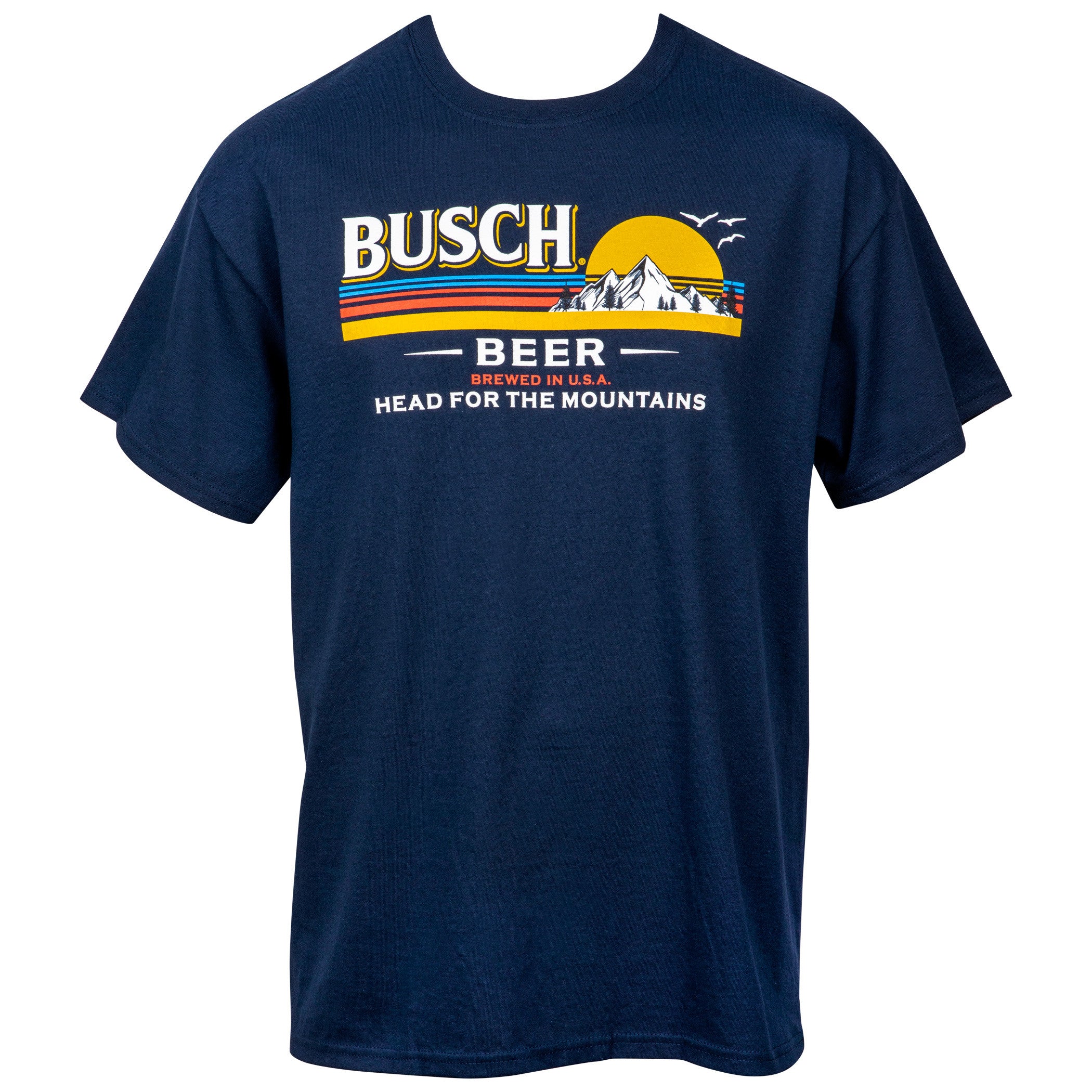 Officially licensed Busch Beer Head for the Mountains Logo T-Shirt. Made from 100% cotton, this men's blue t-shirt features the authentic "Busch Beer" logo and vintage "Head For The Mountains" logo design on the front.