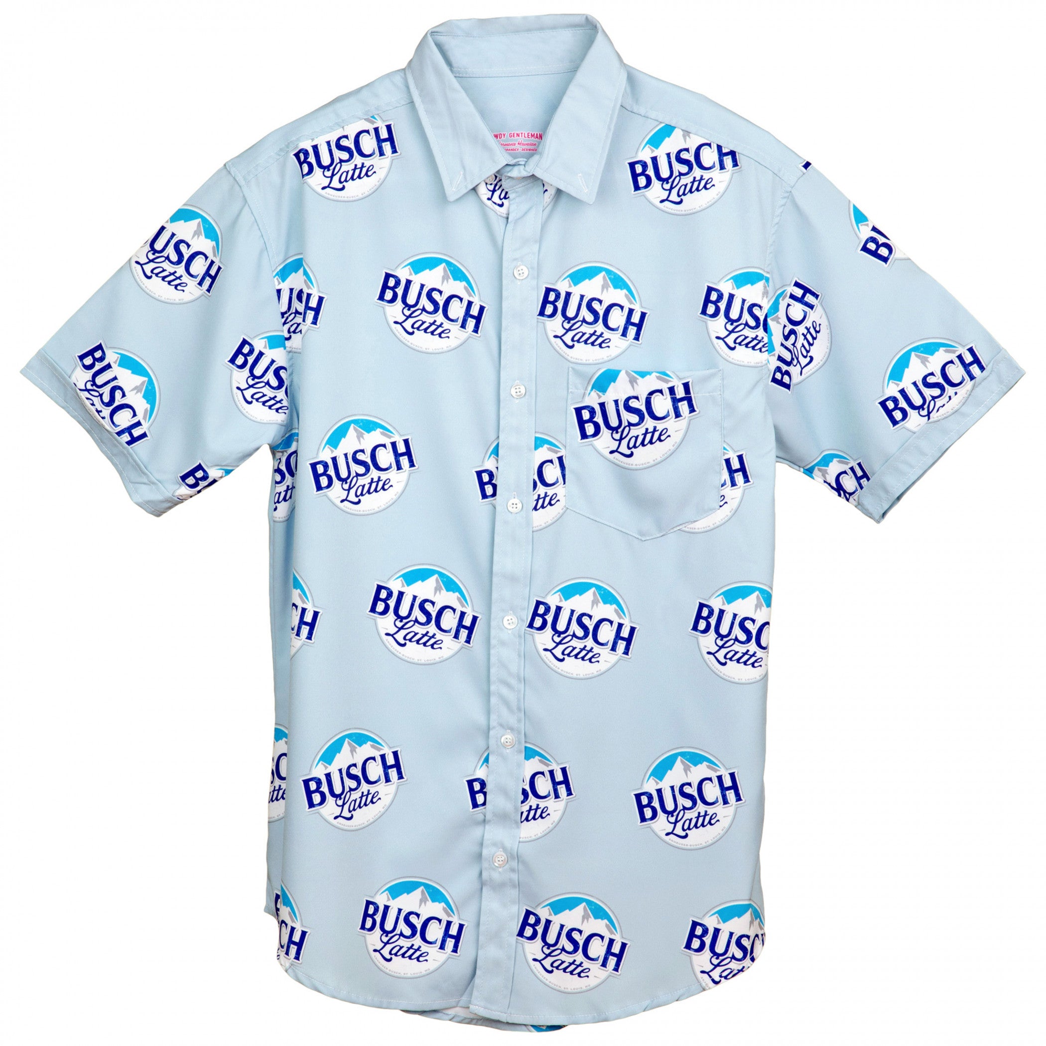 Officially licensed Busch Latte All Over Print Button Down Hawaiian Shirt. This blue "Busch Latte" Button Down Hawaiian Shirt is made from polyester and features a classic "Busch Latte" logo all-over print design.