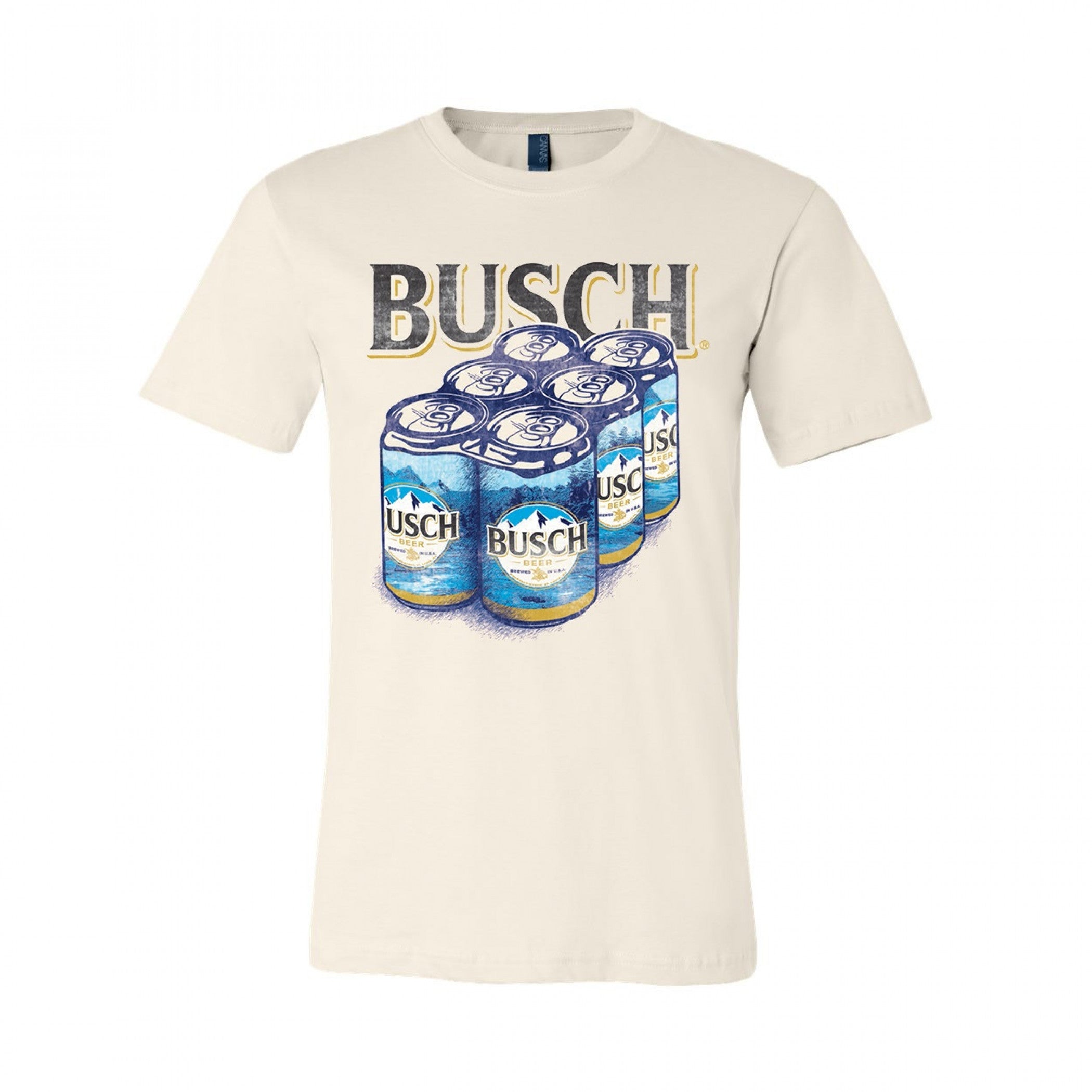 Officially licensed Busch Six Pack Logo T-Shirt. This white "Busch Beer" t-shirt is made from cotton and features a hand-drawn "Busch Six Pack" design on the front.