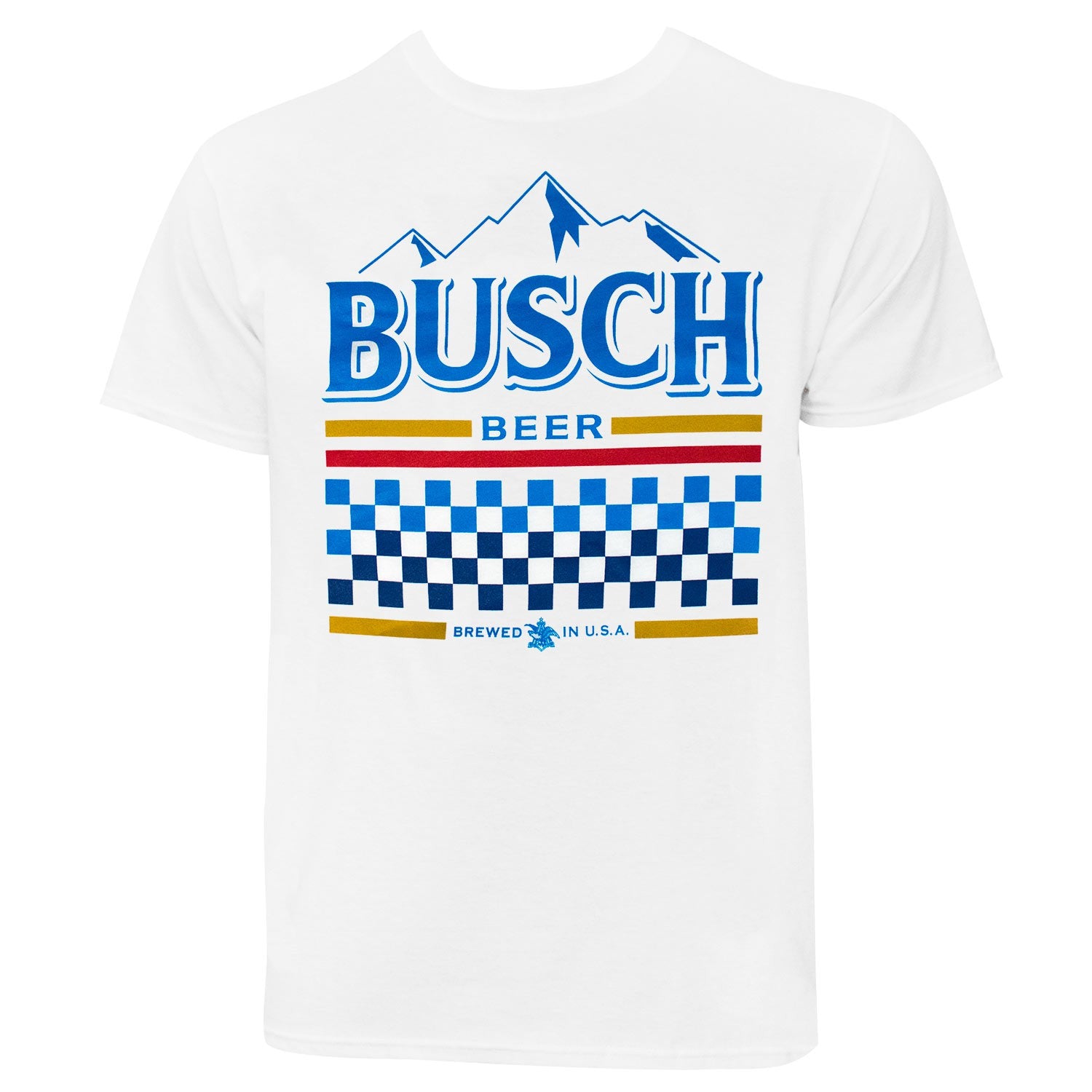 Men's white Busch Beer t-shirt. Made from 100% cotton, this tee features the "Busch Beer" logo and racing checkers on the front. Officially licensed.