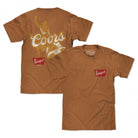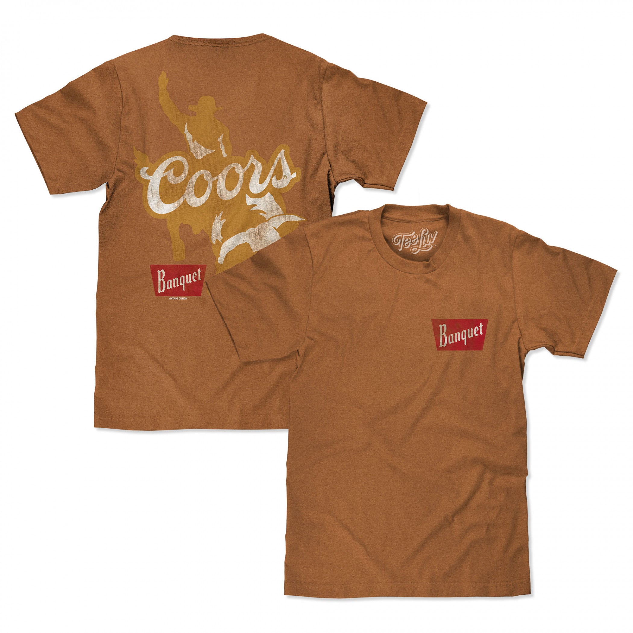 Officially licensed Coors Banquet Rodeo Bull Riding Front and Back Print T-Shirt. This brown "Coors Banquet" t-shirt is made from cotton and features a classic "Coors Banquet Rodeo Bull Riding" logo printed on the front and back.