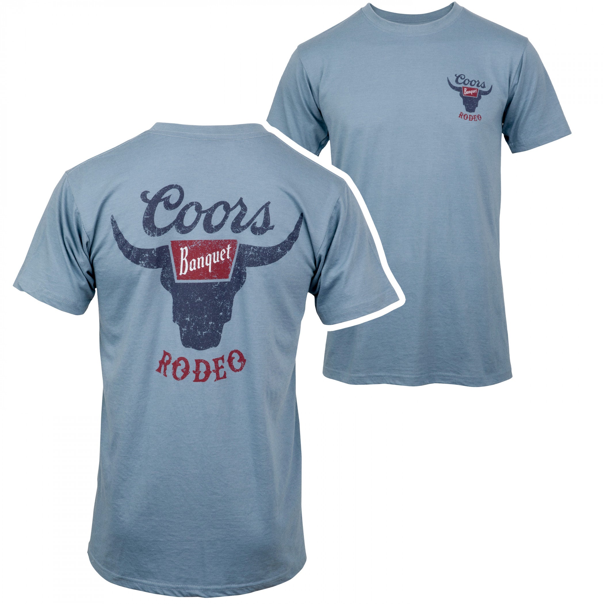 Officially licensed Coors Banquet Rodeo Logo Distressed Front and Back Dusty Blue T-Shirt. This dusty blue "Coors Banquet" t-shirt is made from cotton and features a distressed "Coors Banquet Rodeo" logo design printed on the front and back.