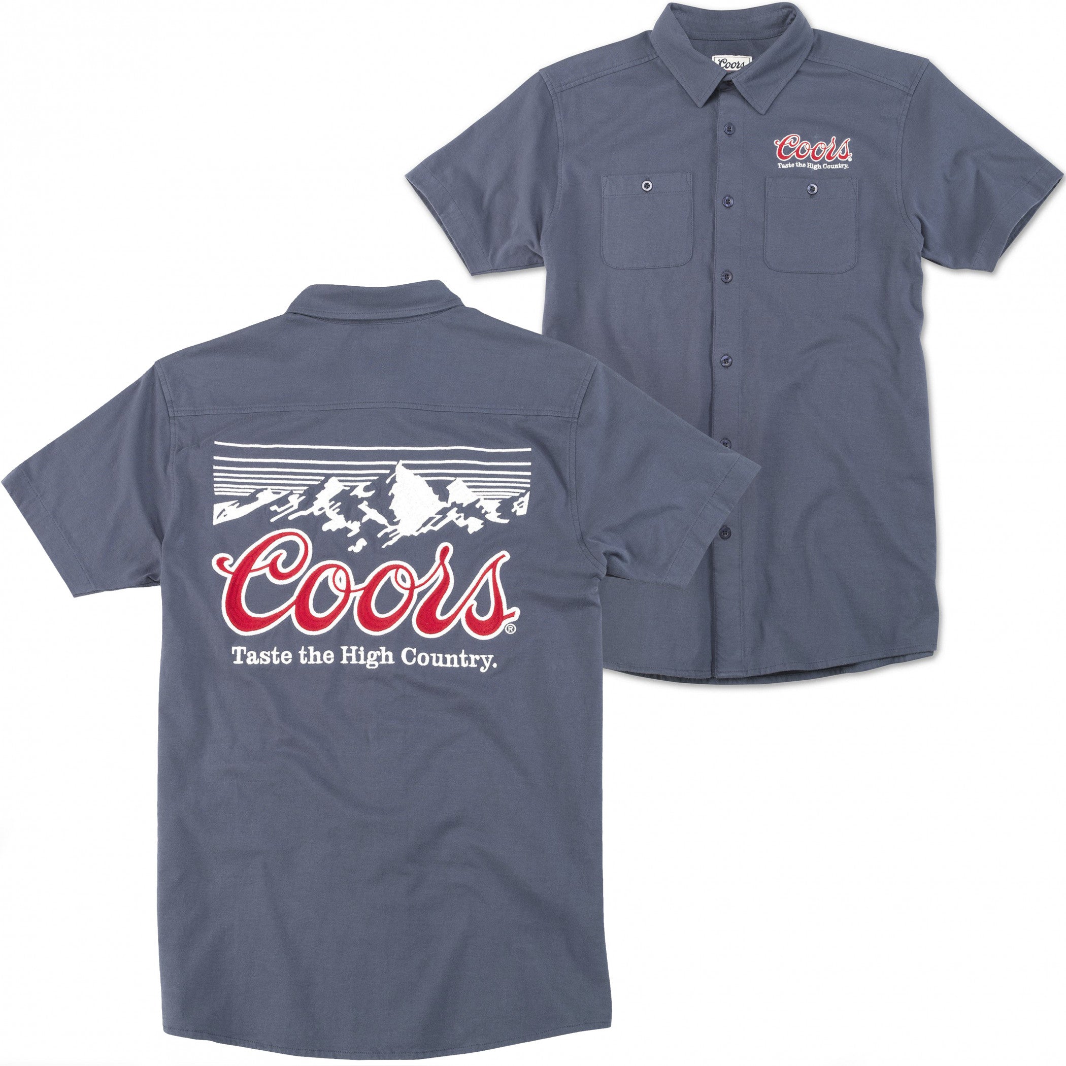 Officially licensed Coors Mountain Range Button Down Front and Back Print Shirt. This blue "Coors" Short Sleeve Button Down is made from cotton and features a classic "Coors" Mountain Range logo printed on the front and back.