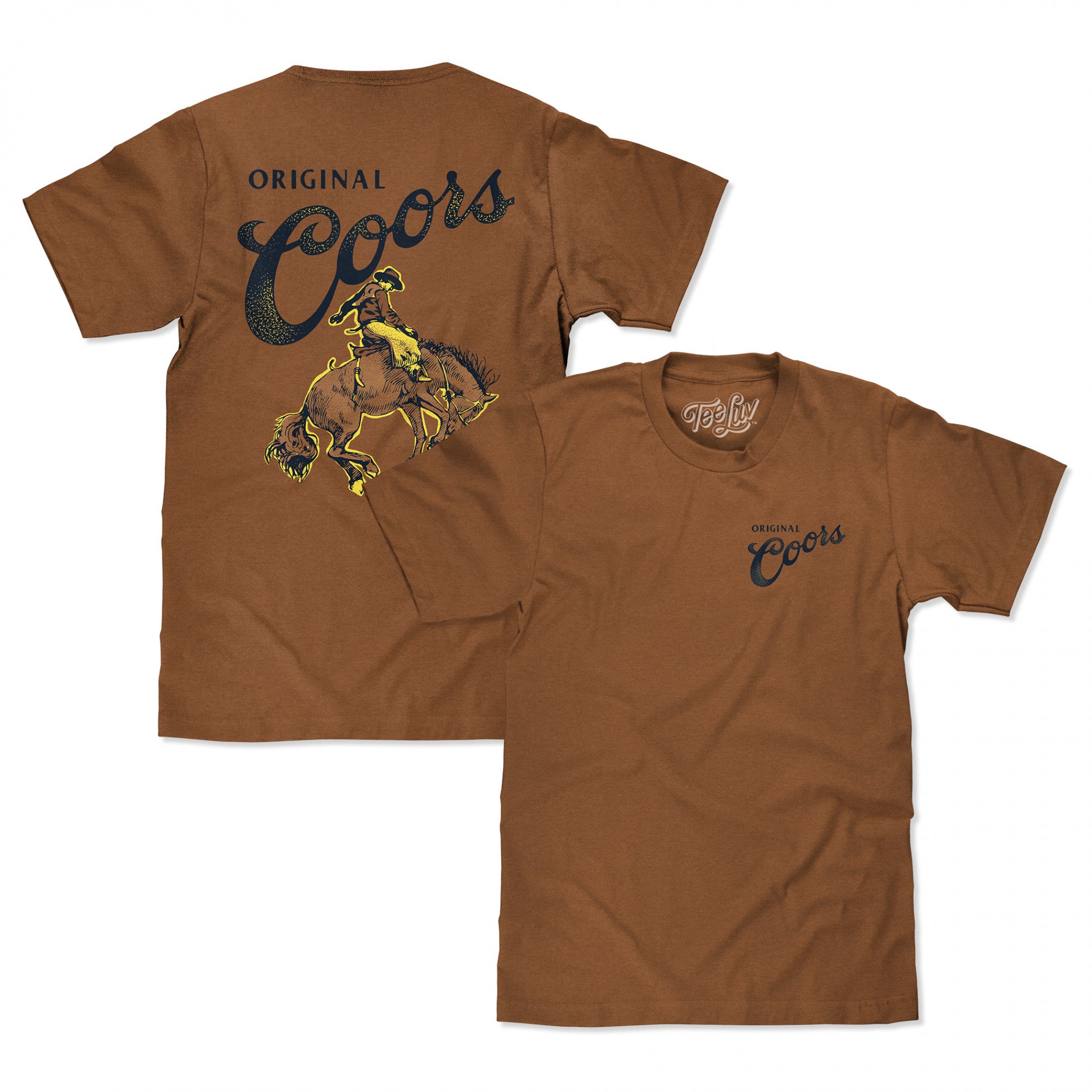 Officially licensed Coors Original Rodeo Time Front and Back Print T-Shirt. This brown "Coors Original" t-shirt is made from cotton and features the classic "Coors Original" RodeoTime front and back logo print.