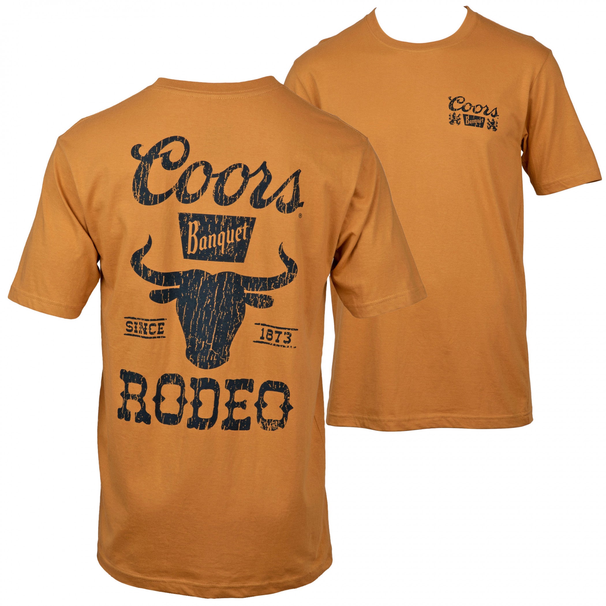 Officially licensed Coors Rodeo Logo Distressed Front & Back Print T-Shirt. This "Coors Banquet" Brown Colorway T-Shirt is made from cotton and features a distressed "Coors Rodeo" logo printed on the front and the back.