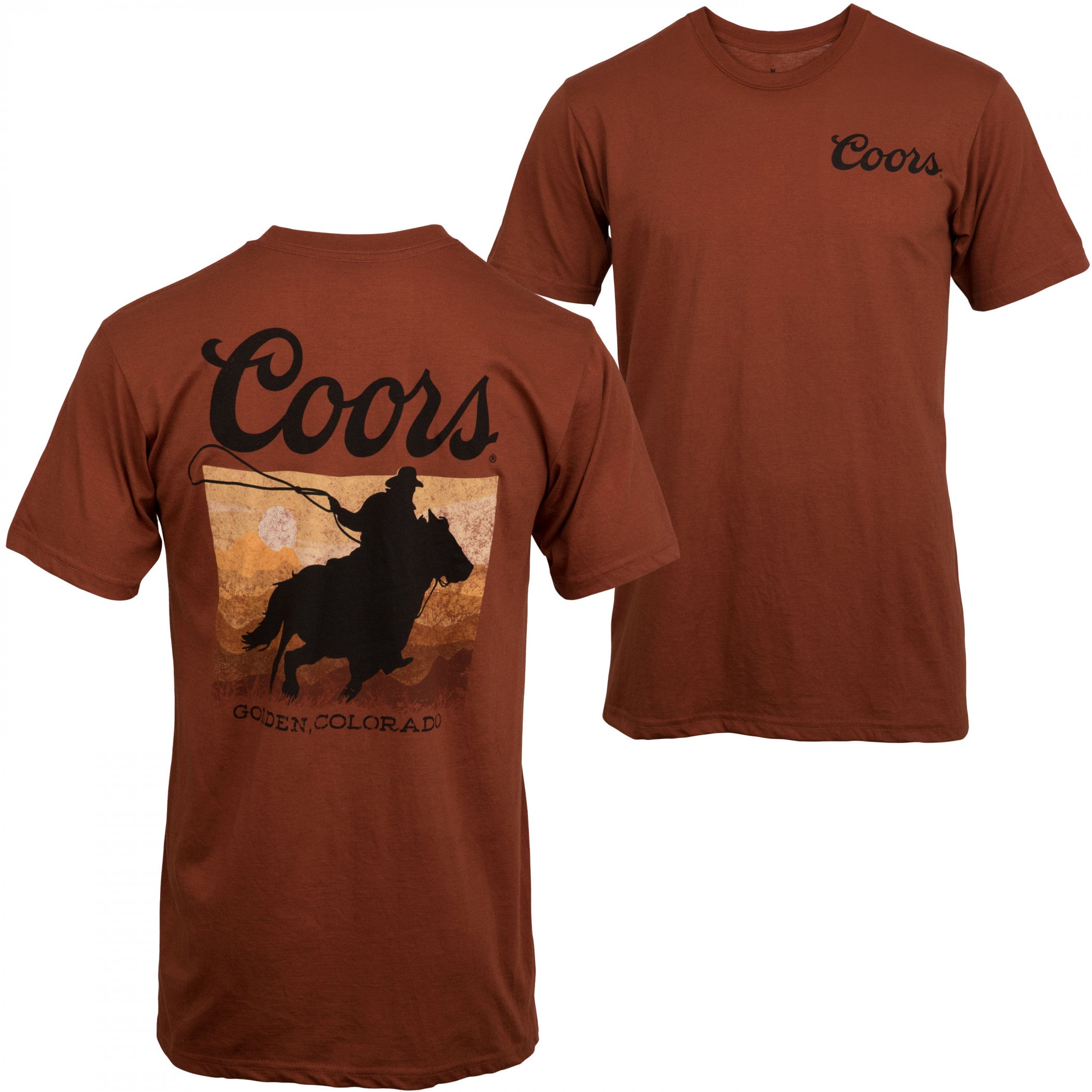 Officially licensed Coors Sunset Rider Front and Back Print T-Shirt. This orange "Coors" t-shirt is made from cotton and features a classic "Coors Sunset Rider" graphic and logo printed on the front and back.