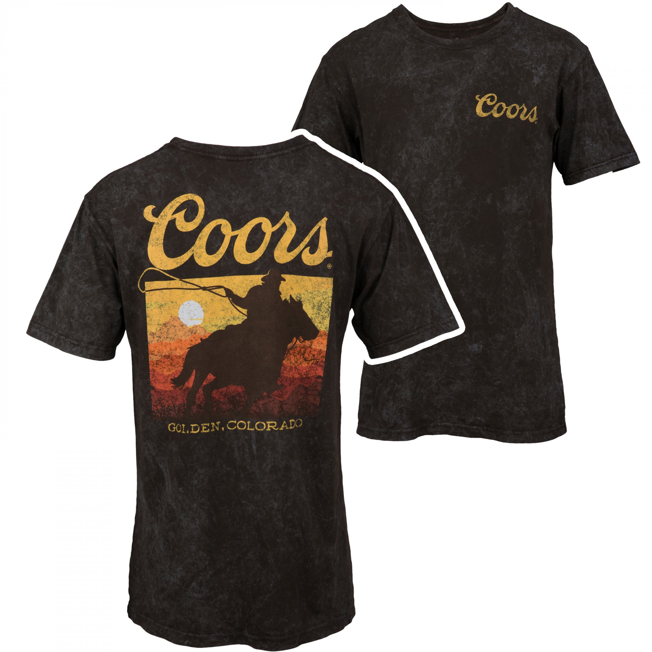 Officially licensed Coors Western Sunset Front and Back Print T-Shirt. This black acid washed "Coors" t-shirt is made from cotton and features a classic "Coors Western Sunset" logo design printed on the front and back.