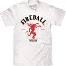 Officially licensed Fireball Whisky Logo White Colorway T-Shirt. This white "Fireball Whisky" t-shirt is made from cotton and features the classic "Fireball Whisky" logo printed on the front.