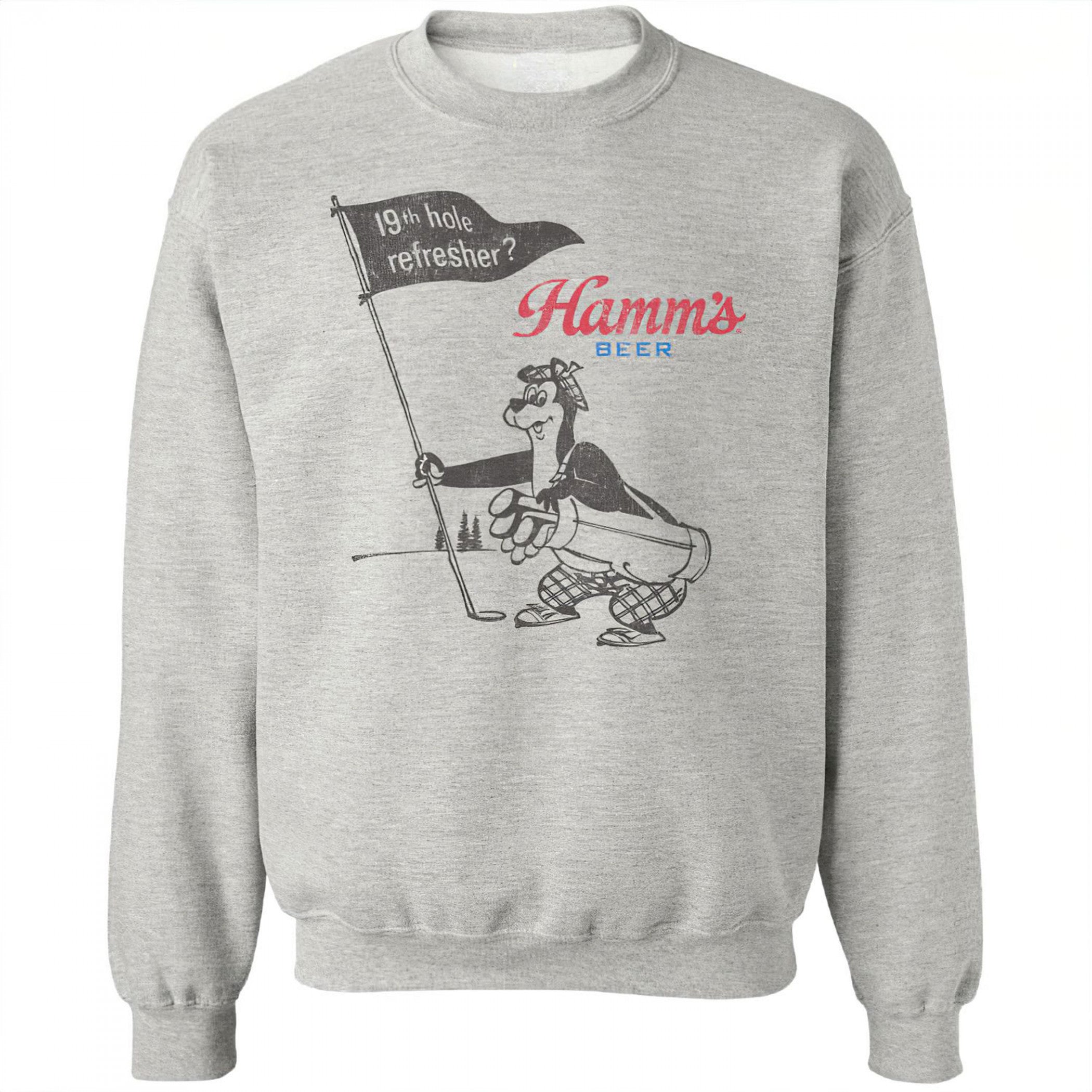 Officially licensed Hamm's Beer 19th Hole Golf Crewneck Sweatshirt. This grey "Hamm's Beer" crewneck sweatshirt is made from cotton and features a vintage "Hamm's Beer 19th Hole Golf" logo design printed on the front.