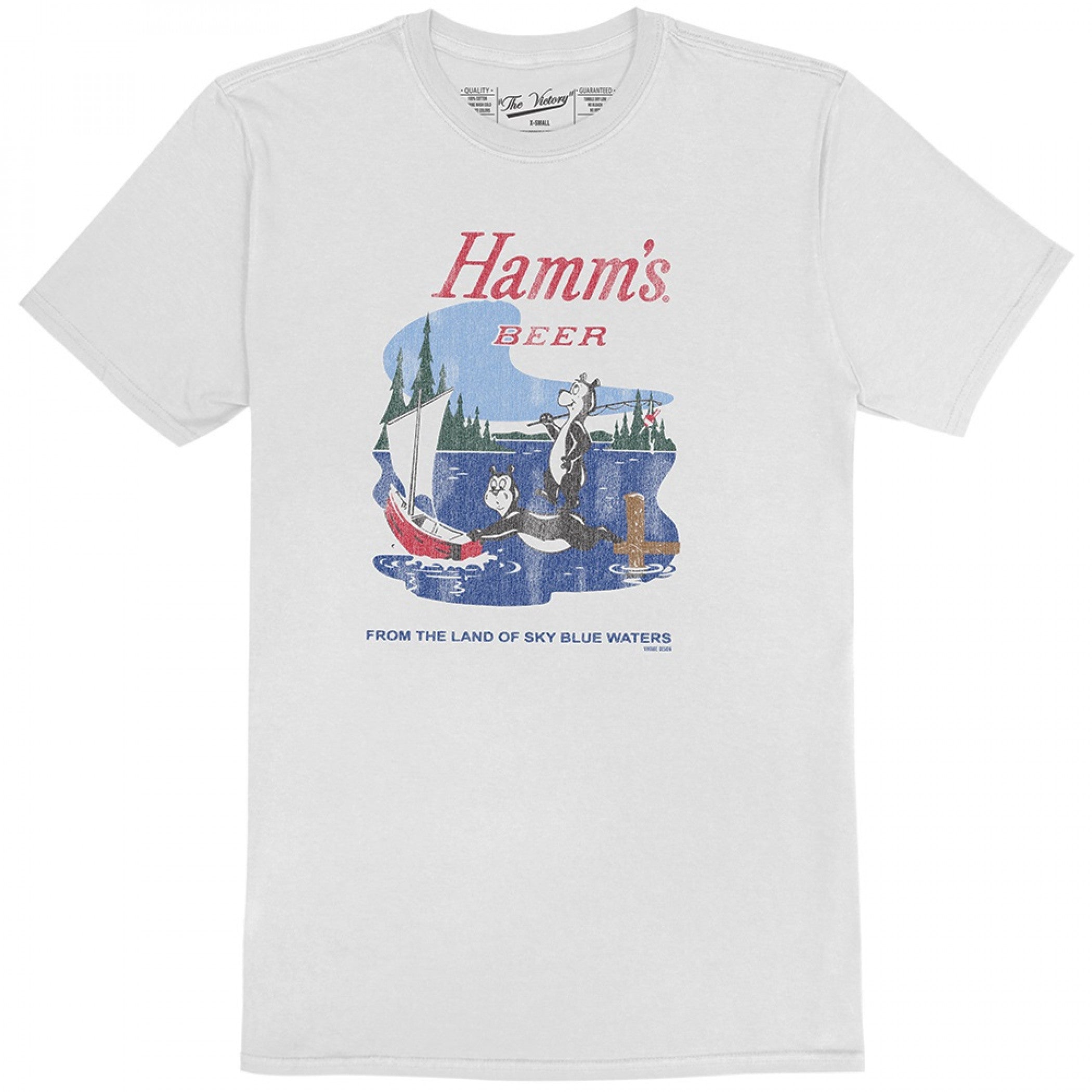 Officially licensed Hamm's Beer Bears at the Lake Retro Style T-Shirt. This white "Hamm's Beer" t-shirt is made from cotton and features a "Hamm's Beer Bears at the Lake" retro graphic design.