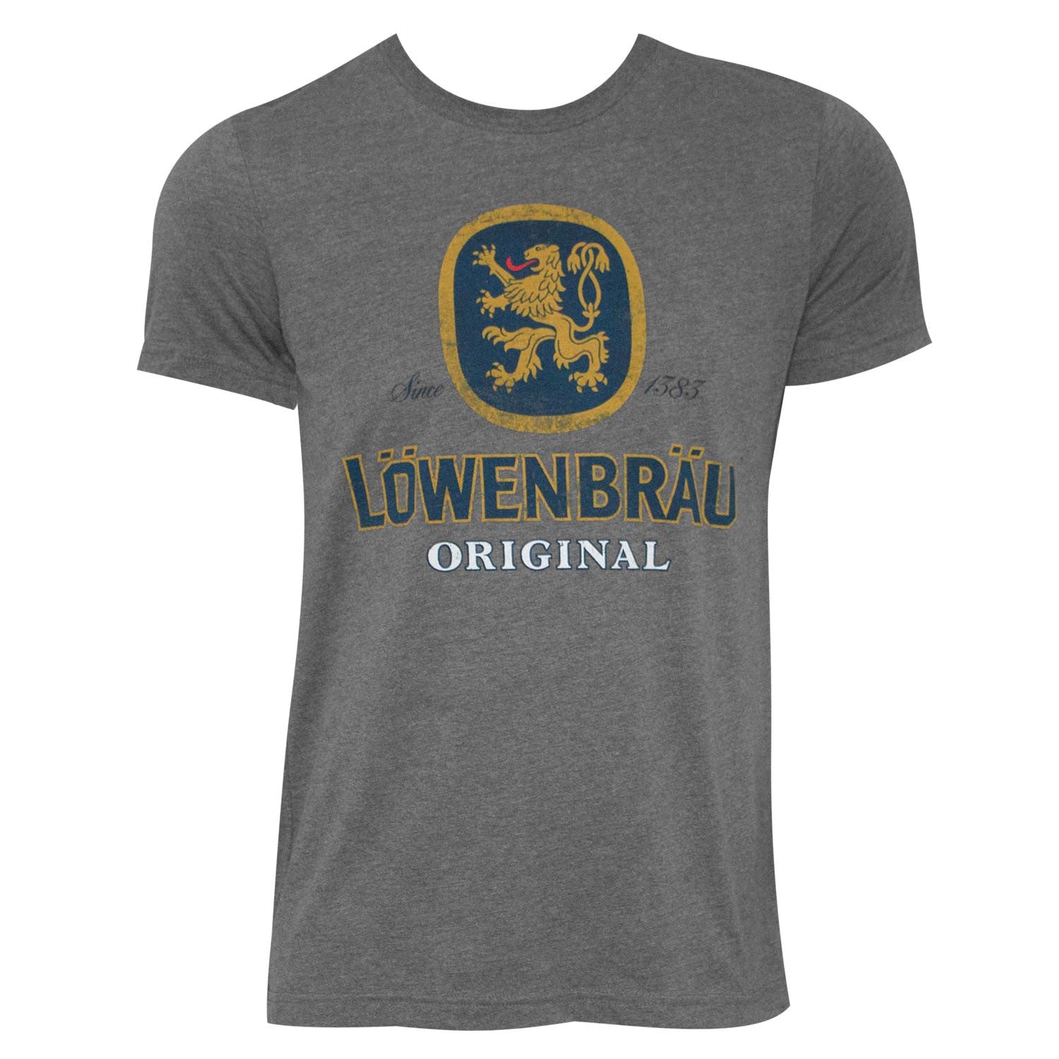 Men's grey Lowenbrau t-shirt. Made from a cotton/poly blend, this tee features a "Lowenbrau" logo on the front. Officially licensed.