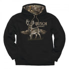 Officially licensed Busch Light Deer Camo Pull-Over Hoodie. This "Busch Light" black hoodie is made from a cotton-poly blend and features an all-over deer camo print with a bold "Busch Light" logo across the chest.