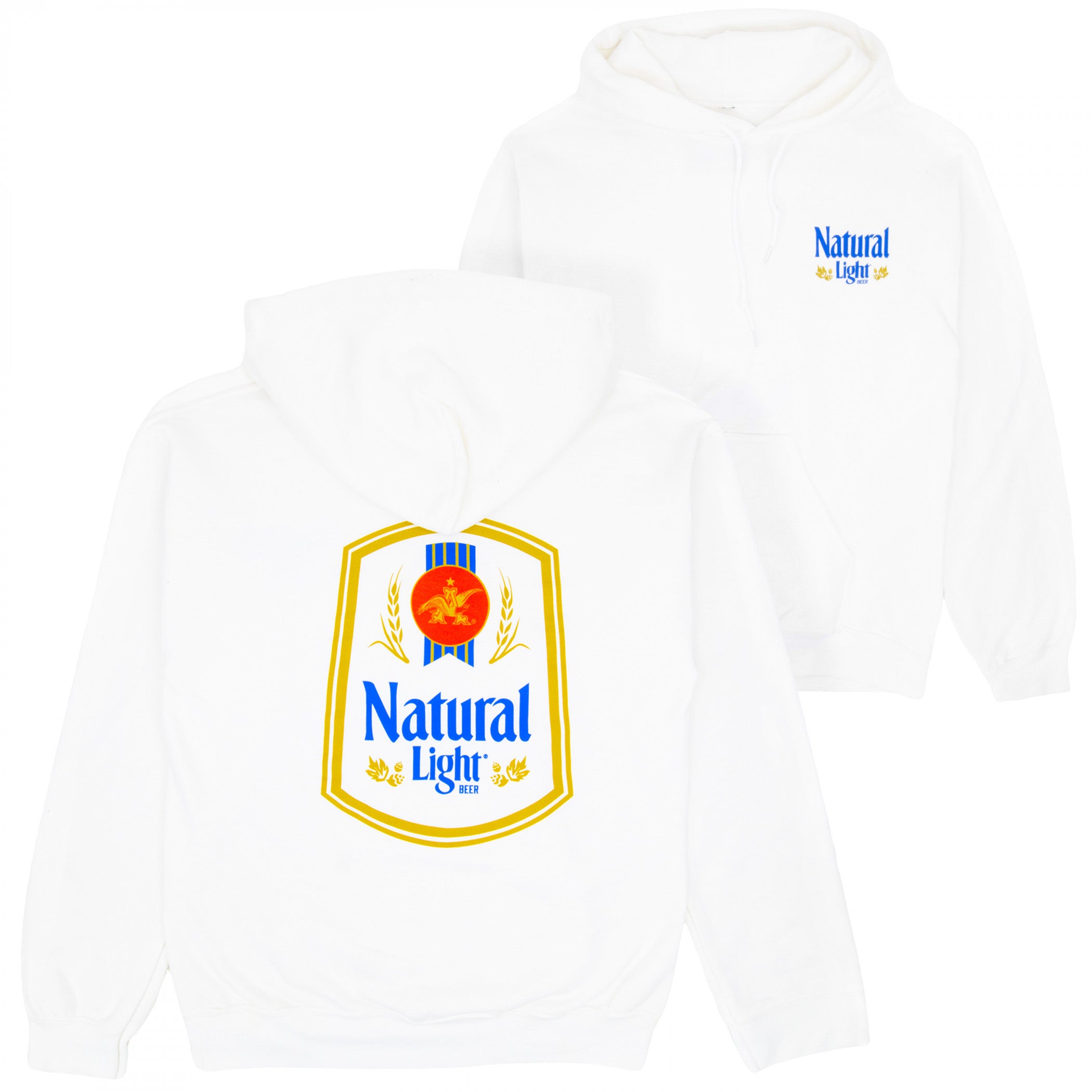 Officially licensed Natural Light Label White Front and Back Print Hoodie. This white "Natural Light" hoodie is made from cotton and features the iconic label logo printed on both the front and back of a soft pullover silhouette.