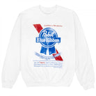 Officially licensed Pabst Blue Ribbon Beer Can Label Crew Sweatshirt. This white crew neck sweatshirt is made from cotton and features the classic "Pabst Blue Ribbon Beer" label design.