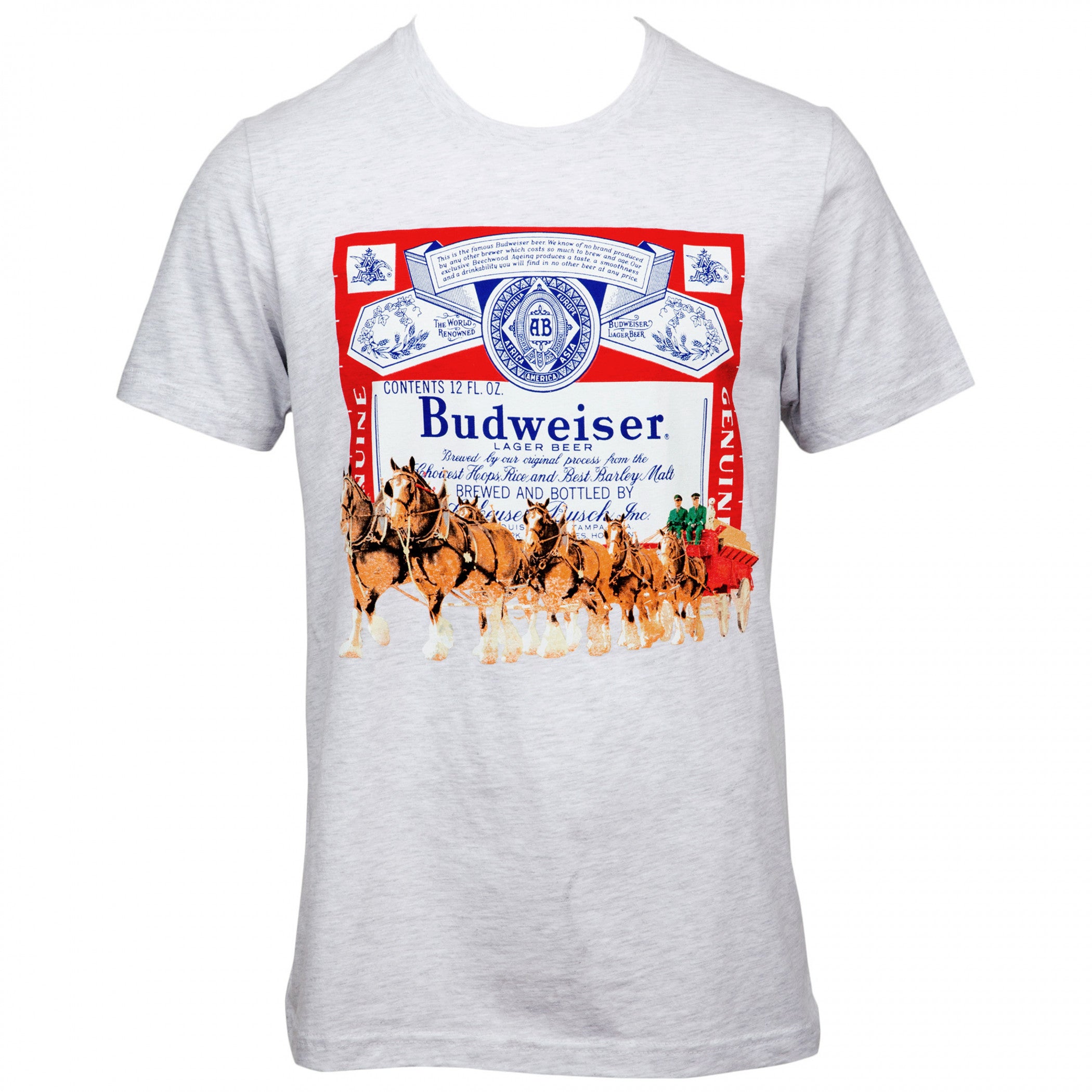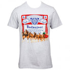 Officially licensed Budweiser Clydesdale Logo T-Shirt. Made from a cotton/poly blend and features the "Budweiser Beer" label and famous "Budweiser Clydesdales" on the front of a grey t-shirt.
