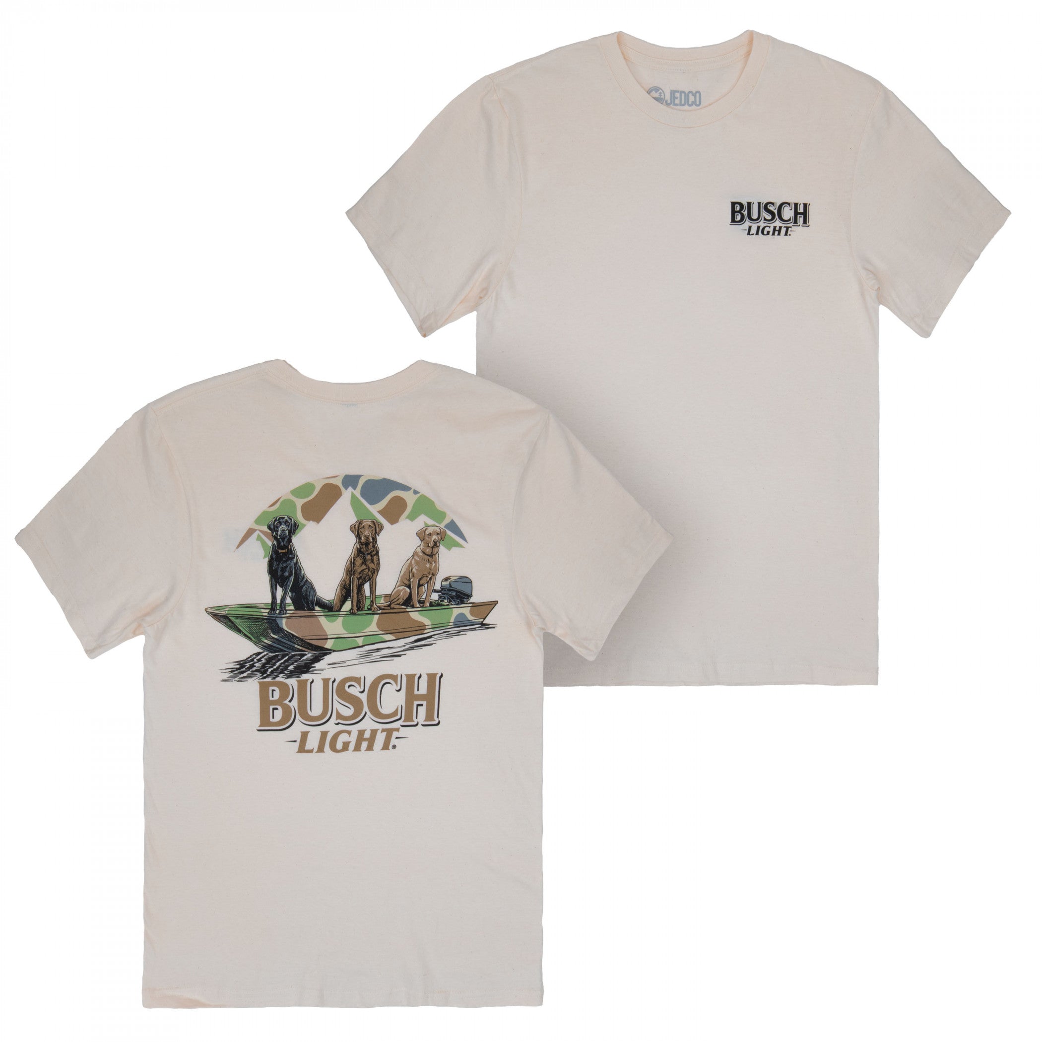 Officially licensed Busch Light Camo Boat Dogs Front and Back Print T-Shirt. This beige "Busch Light" t-shirt is made from super soft, 100% preshrunk combed ringspun cotton jersey (4.3 oz., 30/1’s) and features the classic "Busch Light" logo on the front with a "Busch Light" camo boat dogs scene printed on the back.
