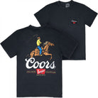 Officially licensed Coors Rodeo Cowboy Premium Super Soft Heavyweight Front Pocket Back-Print T-Shirt. This "Coors Banquet" black t-shirt is made from 100% heavyweight cotton and features a front pocket with a hand sewn "Coors" logo patch and large "Coors Rodeo" Cowboy logo design printed on the back.
