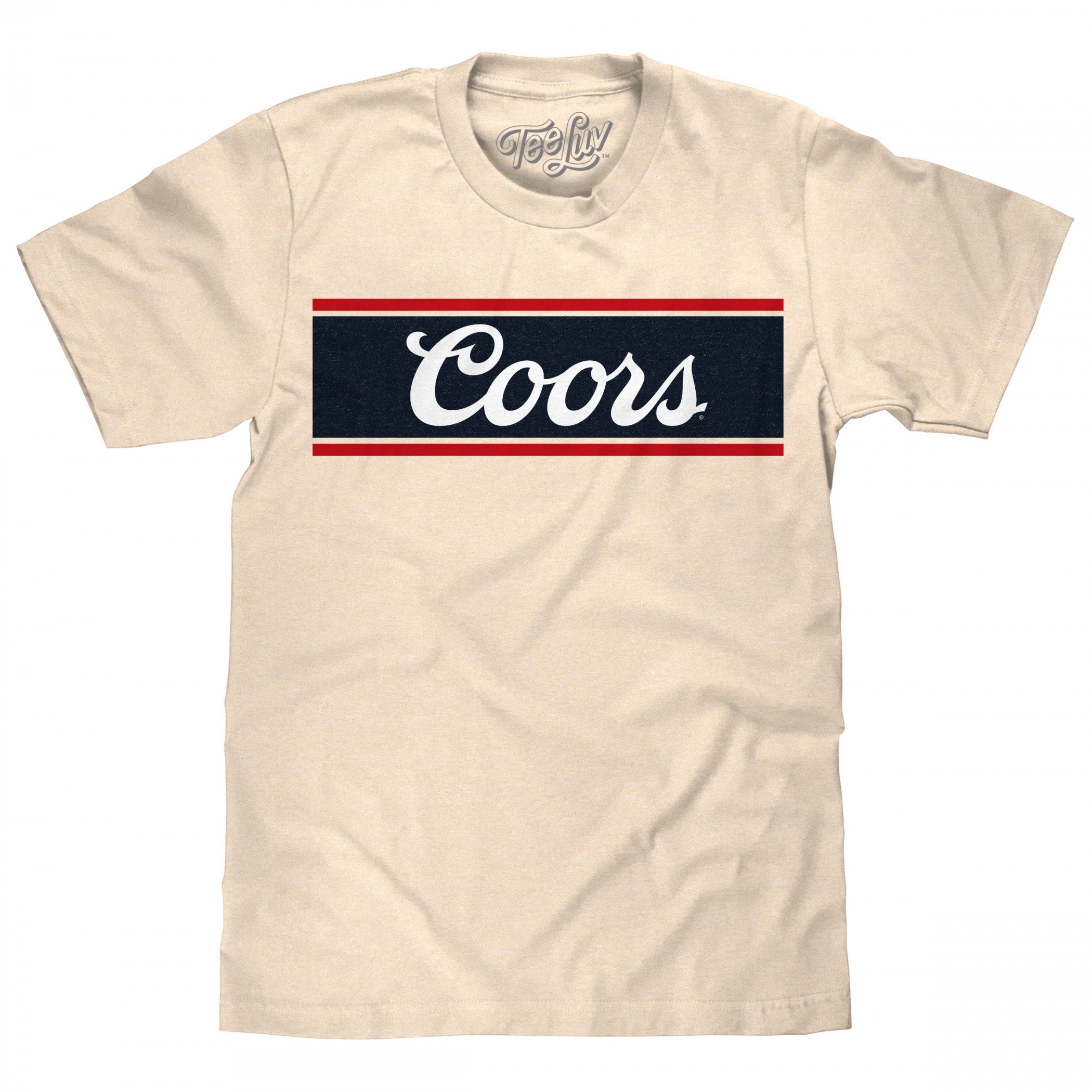 Officially licensed Coors Stripe Logo Cream Colorway T-Shirt. This beige "Coors Banquet" t-shirt is made from cotton and features a classic "Coors" stripe logo printed on the front.