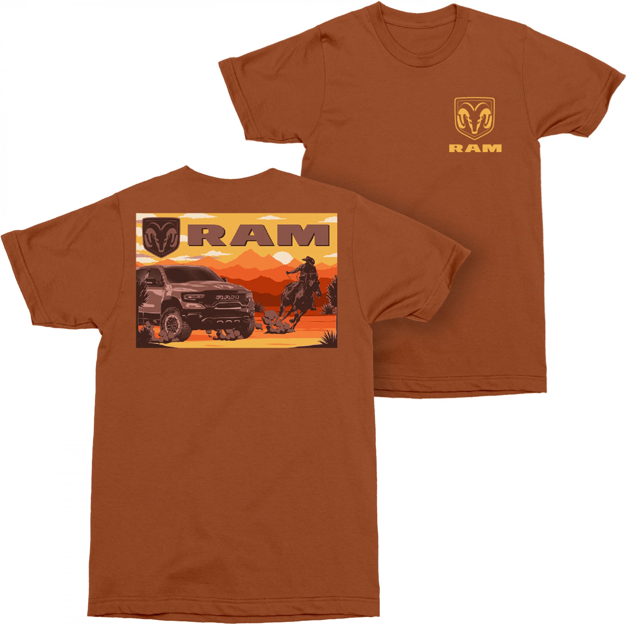 Officially licensed Dodge Ram Riding out West Front and Back Print T-Shirt. This brown "Dodge Ram" t-shirt is made from cotton and features a cool "Dodge Ram Riding out West" logo design printed on the front and back.