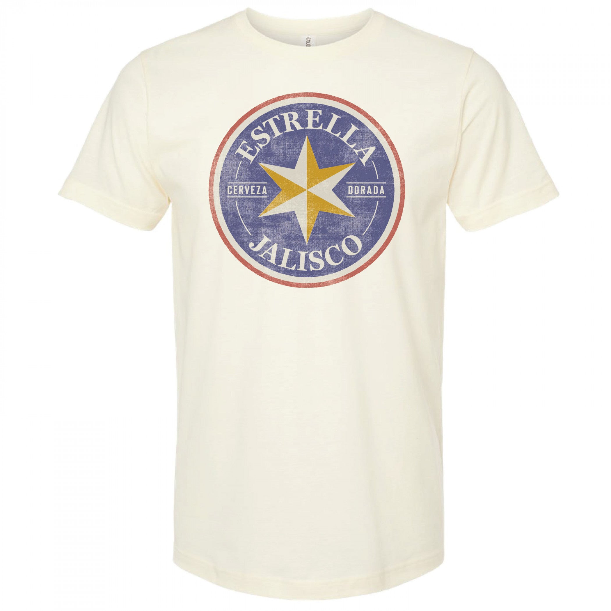 Officially licensed Estrella Jalisco Distressed Logo T-Shirt. This beige "Estrella Jalisco" t-shirt is made from cotton and features a distressed "Estrella Jalisco" logo printed on the front.