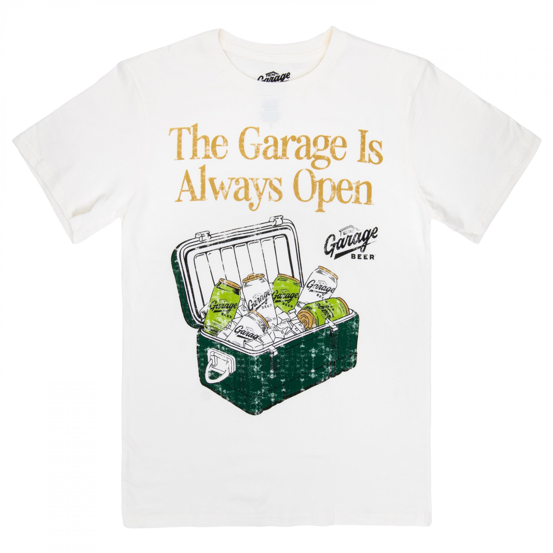 Officially licensed Garage Beer The Garage is Always Open T-Shirt. This white "Garage Beer" t-shirt is made from cotton and features a “The Garage is Always Open” design printed on the front.