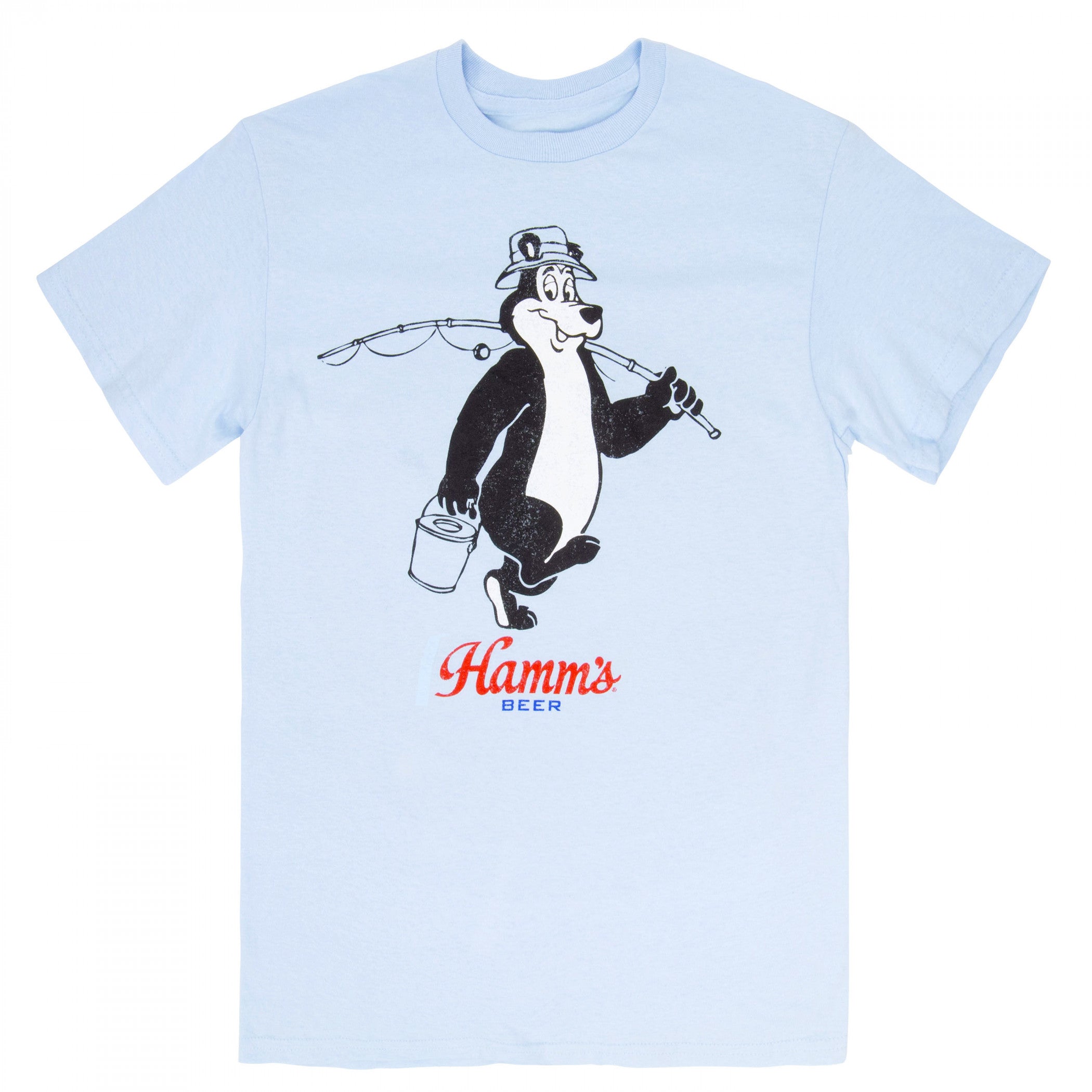 Officially licensed Hamm's Beer Bear Gone Fishin' T-Shirt. This blue "Hamm's Beer" t-shirt is made from cotton and features a classic "Hamm's Beer Bear" Gone Fishin' character design on the front.