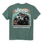Officially licensed Jeep Made to Explore Front and Back Print Pigment Dyed T-Shirt. This green "Jeep" t-shirt is made from cotton and features a fun "Jeep" Made to Explore logo design printed on the front and back.