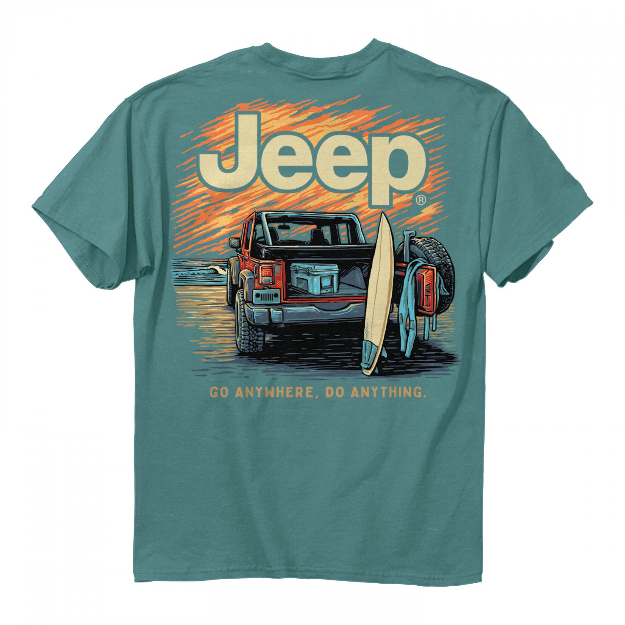 Officially licensed Jeep Surf Beach Front and Back Pigment Dyed Print T-Shirt. This green "Jeep" t-shirt is made from cotton and features a fun "Jeep" Surf Beach logo design printed on the front and back.