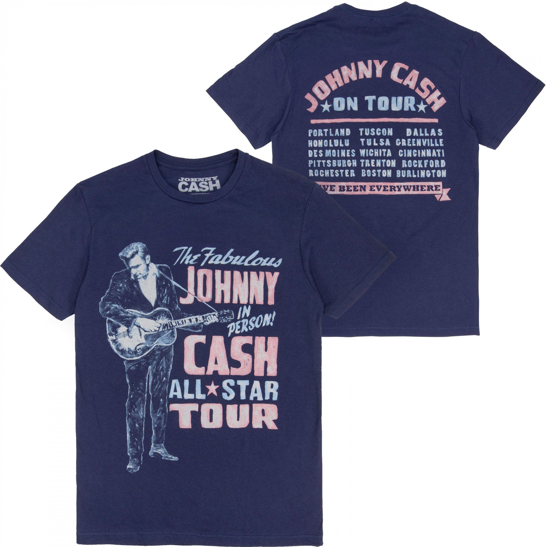 Officially licensed Johnny Cash All Star Tour T-Shirt. This blue "Johnny Cash" t-shirt is made from cotton and features a vintage "Johnny Cash All Star Tour" design printed on the front and back.