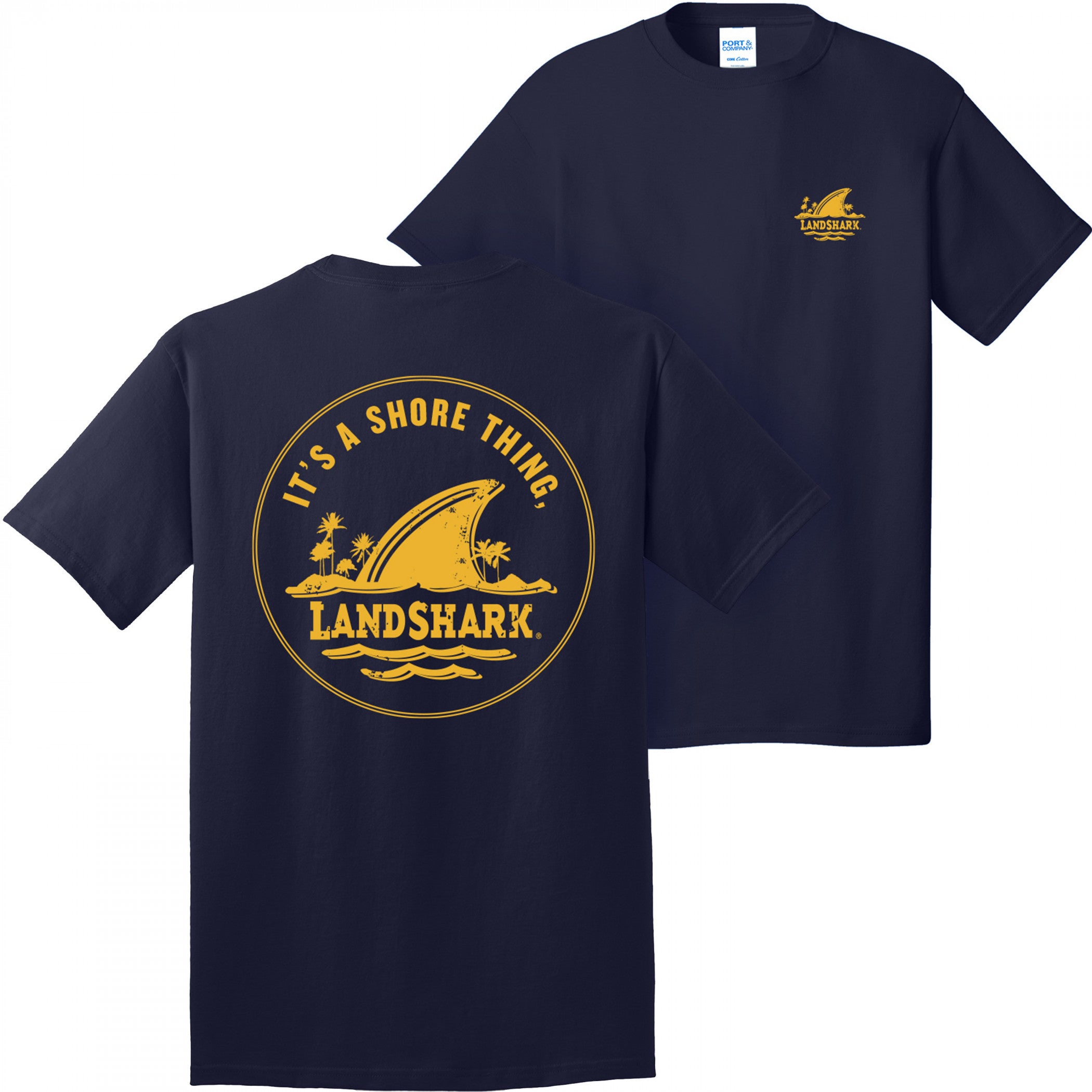 Officially licensed Margaritaville Landshark Sunshine It's A Shore Thing Front Back T-Shirt. This blue and yellow "Landshark" t-shirt is made from cotton and features a cool "Landshark - Sunshine It's A Shore Thing" logo printed on the front and back.