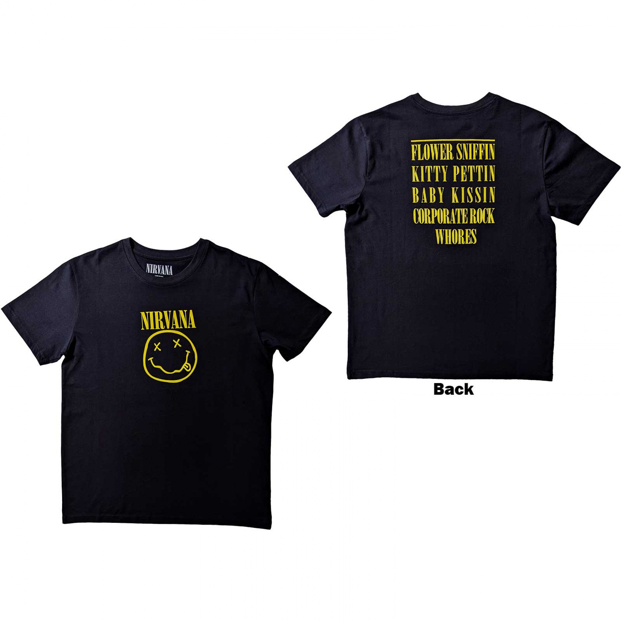 Officially licensed Nirvana Flower Sniffin Front and Back Print T-Shirt. This black "Nirvana" t-shirt is made from cotton and features a "Nirvana - Flower Sniffin" design printed on the front and the back.