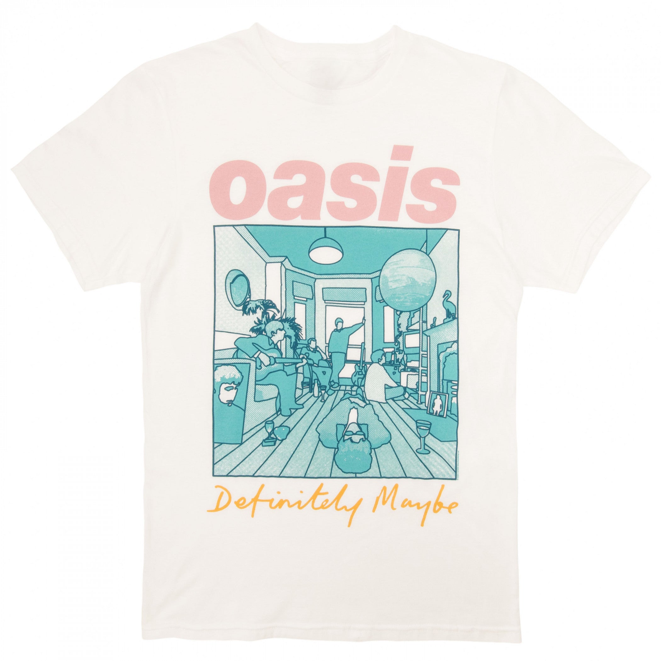 Officially licensed Oasis Definitely Maybe Illustration T-Shirt. This white "Oasis" t-shirt is made from cotton and features a vintage Oasis "Definitely Maybe" Illustration printed on the front.