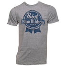 Officially licensed Pabst Blue Ribbon PBR Blue Logo T-Shirt. Made from a cotton/poly blend and features "Pabst Blue Ribbon" blue logo on a grey t-shirt.