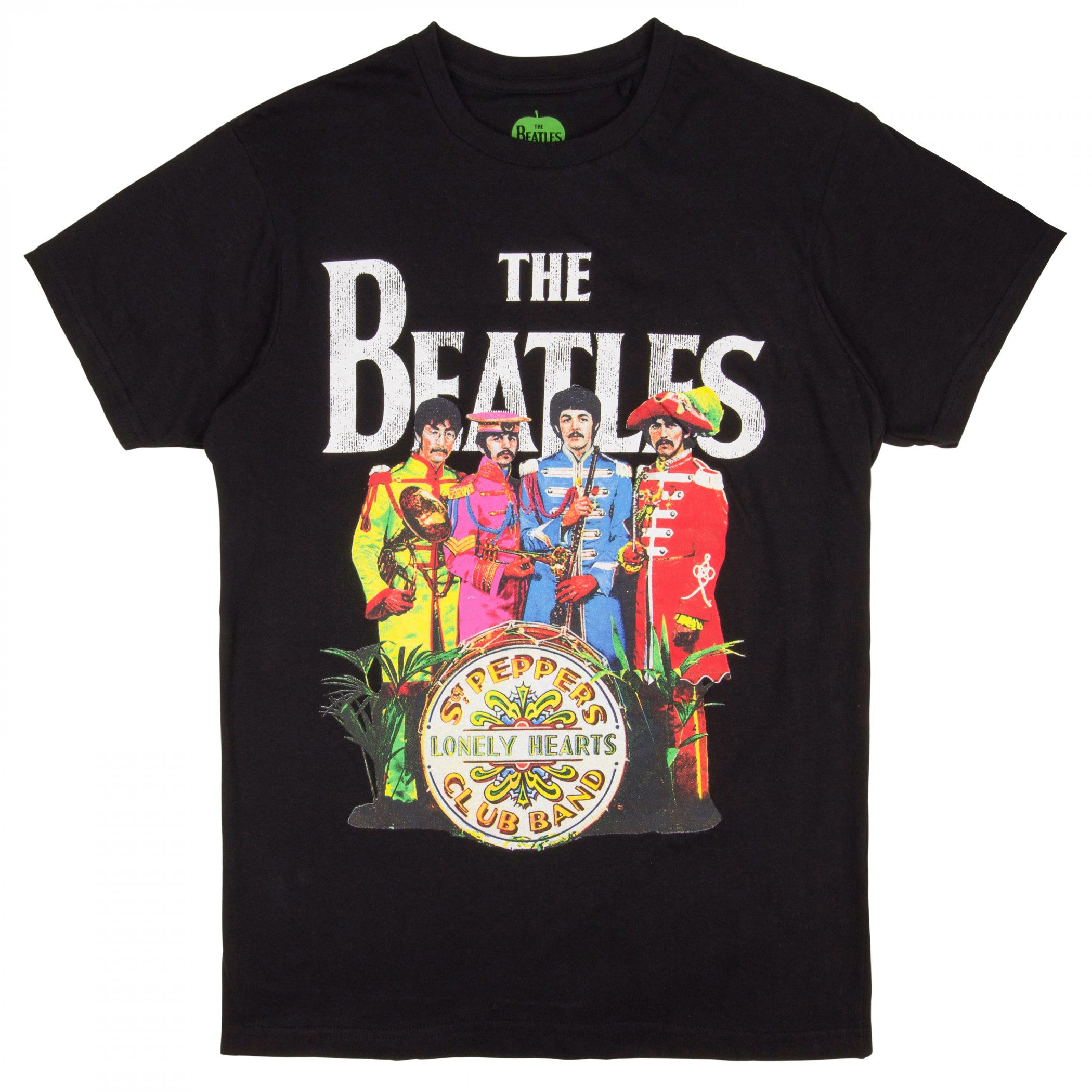 Officially licensed The Beatles Sgt. Pepper's Lonely Hearts Club Band Album Cover T-Shirt. This black "Beatles" t-shirt is made from cotton and features a colorful "Sgt. Pepper's Lonely Hearts Club Band" album cover design printed on the front.