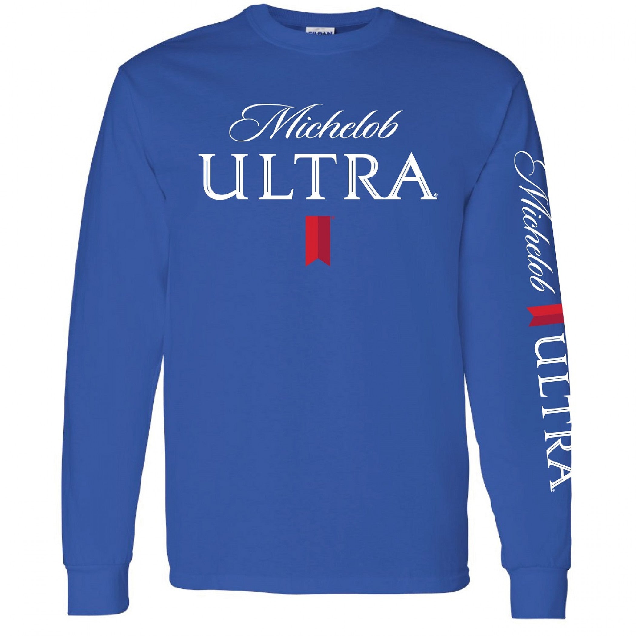 Officially licensed men's Michelob Ultra Sleeve Print Long Sleeve Shirt. Comes in blue and features a “Michelob Ultra" logo on the front and sleeve. Made from cotton.