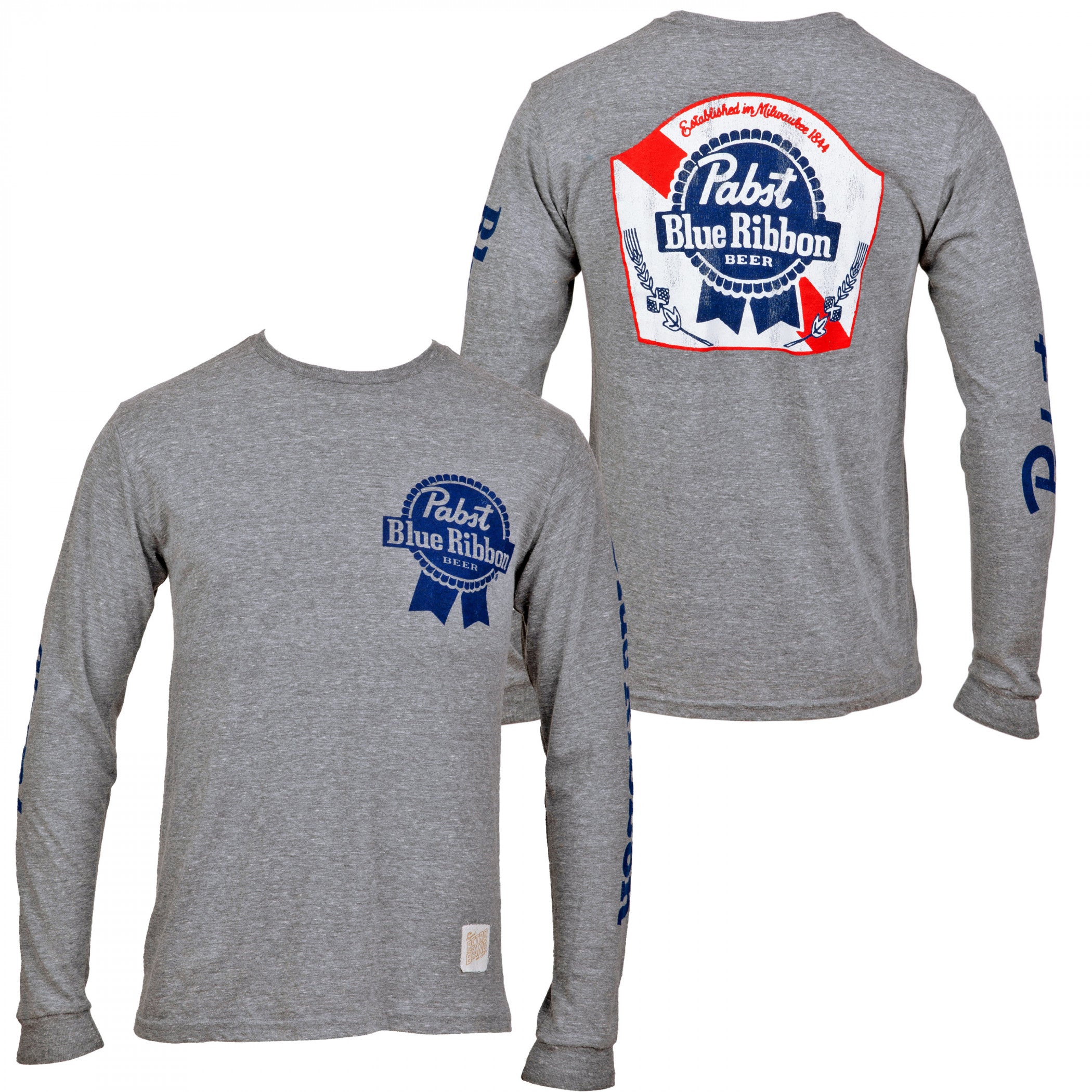 Officially licensed Pabst Blue Ribbon Beer Logo and Sleeve Print Long Sleeve Shirt. This grey long sleeve shirt is made from a cotton/poly blend and features the "Pabst Blue Ribbon Beer" logo on the front and back as well as printed on the sleeves.
