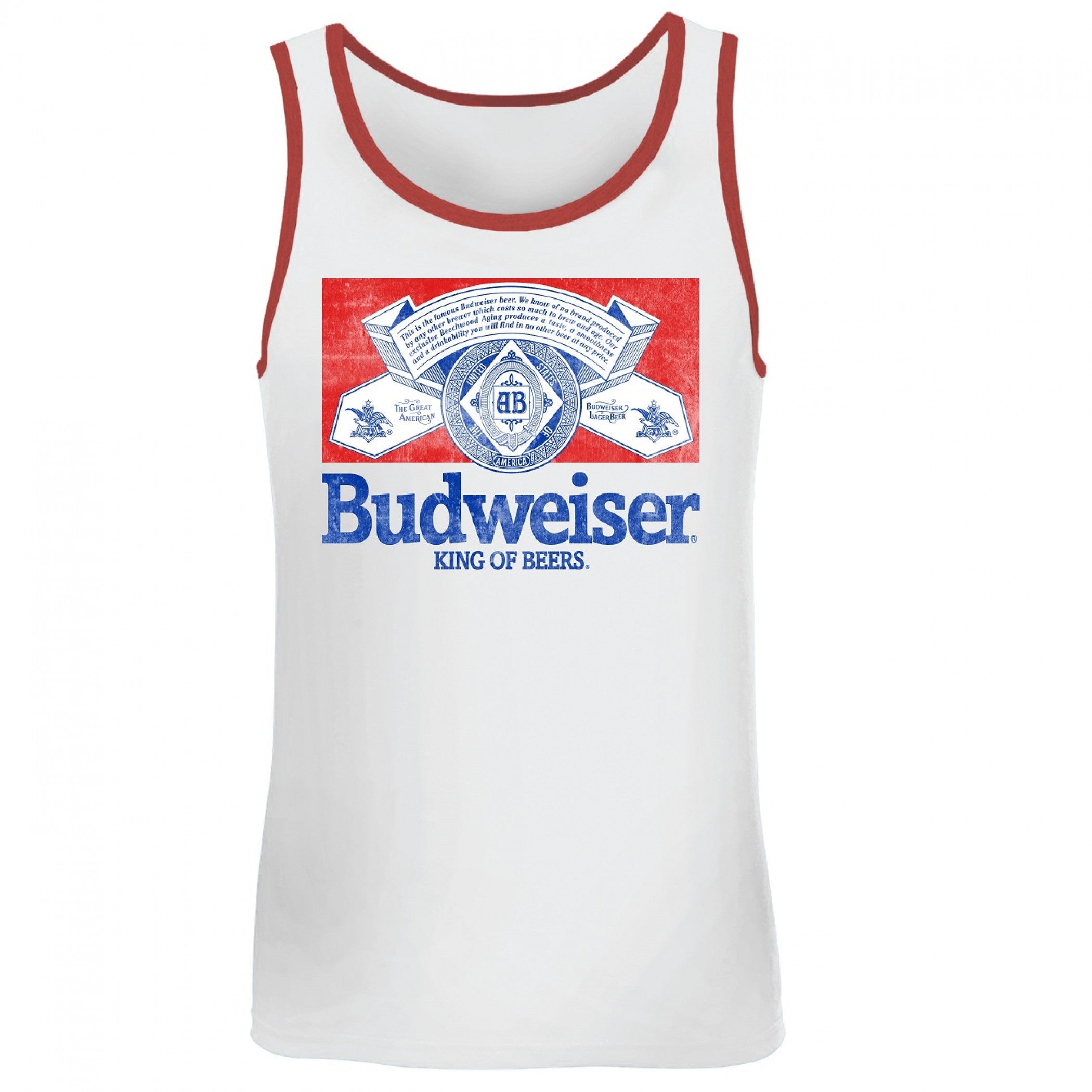 Officially licensed Budweiser King of Beers Red Trim Tank Top. Made from cotton, this white with red trim tank top features the authentic "Budweiser Beer" label design.
