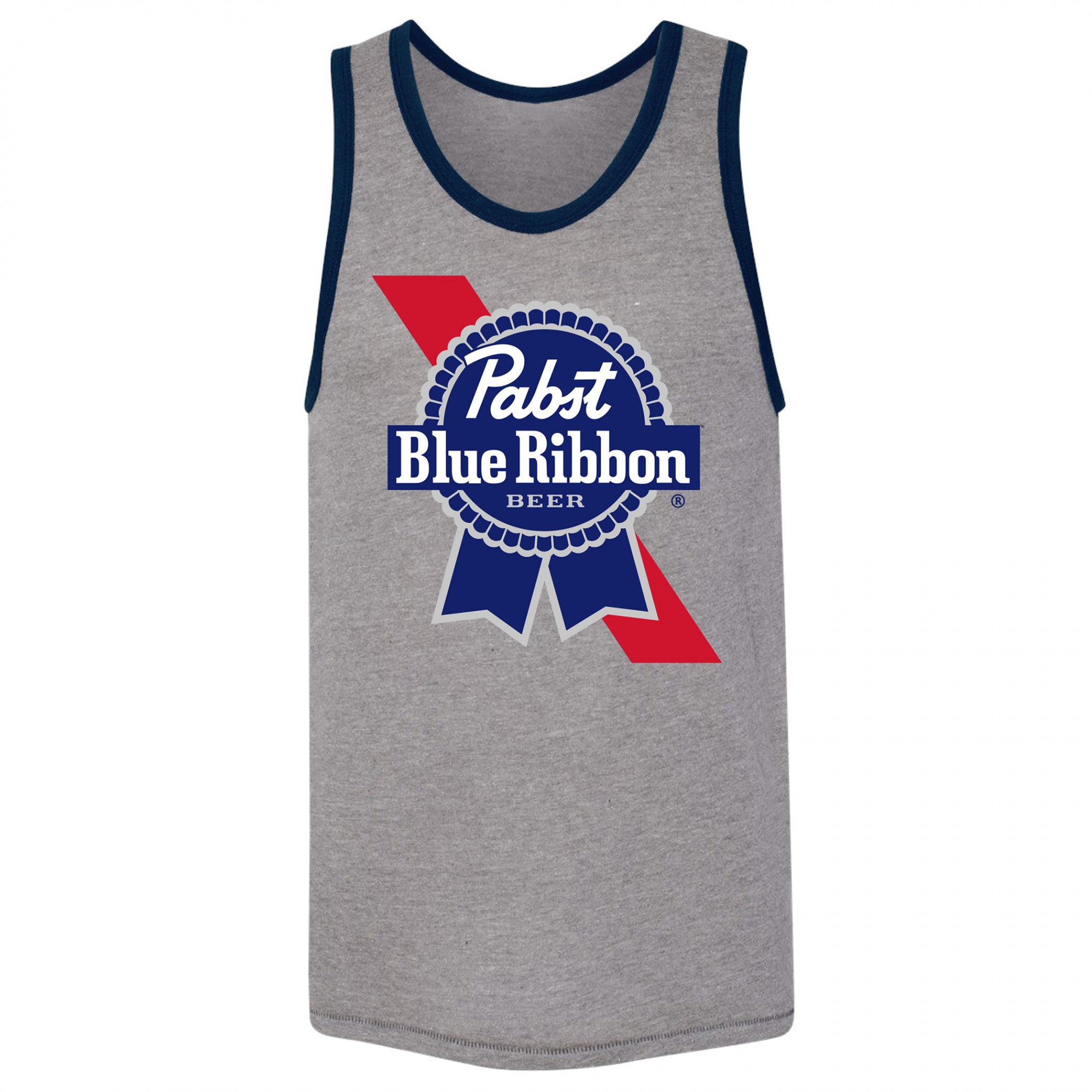 Officially licensed Pabst Blue Ribbon Label & Logo with Blue Trim Grey Tank Top. This grey "Pabst Blue Ribbon Label" tank top is made from cotton and features the classic "Pabst Blue Ribbon" Label & Logo with Blue Trim.