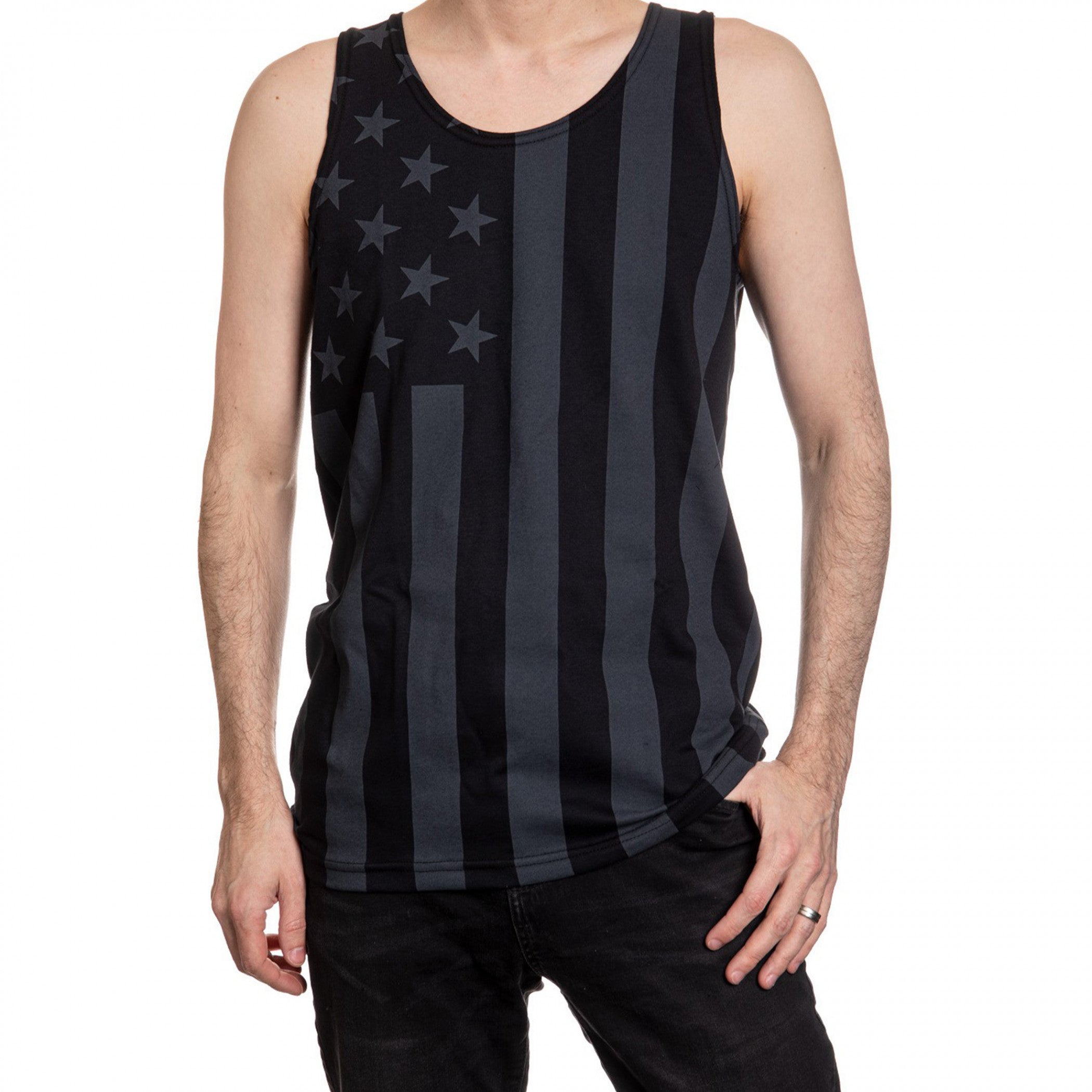 Officially licensed Patriotic Blackout American Flag Tank Top. Made from cotton, this black tank top features a "Patriotic Blackout American Flag" design.