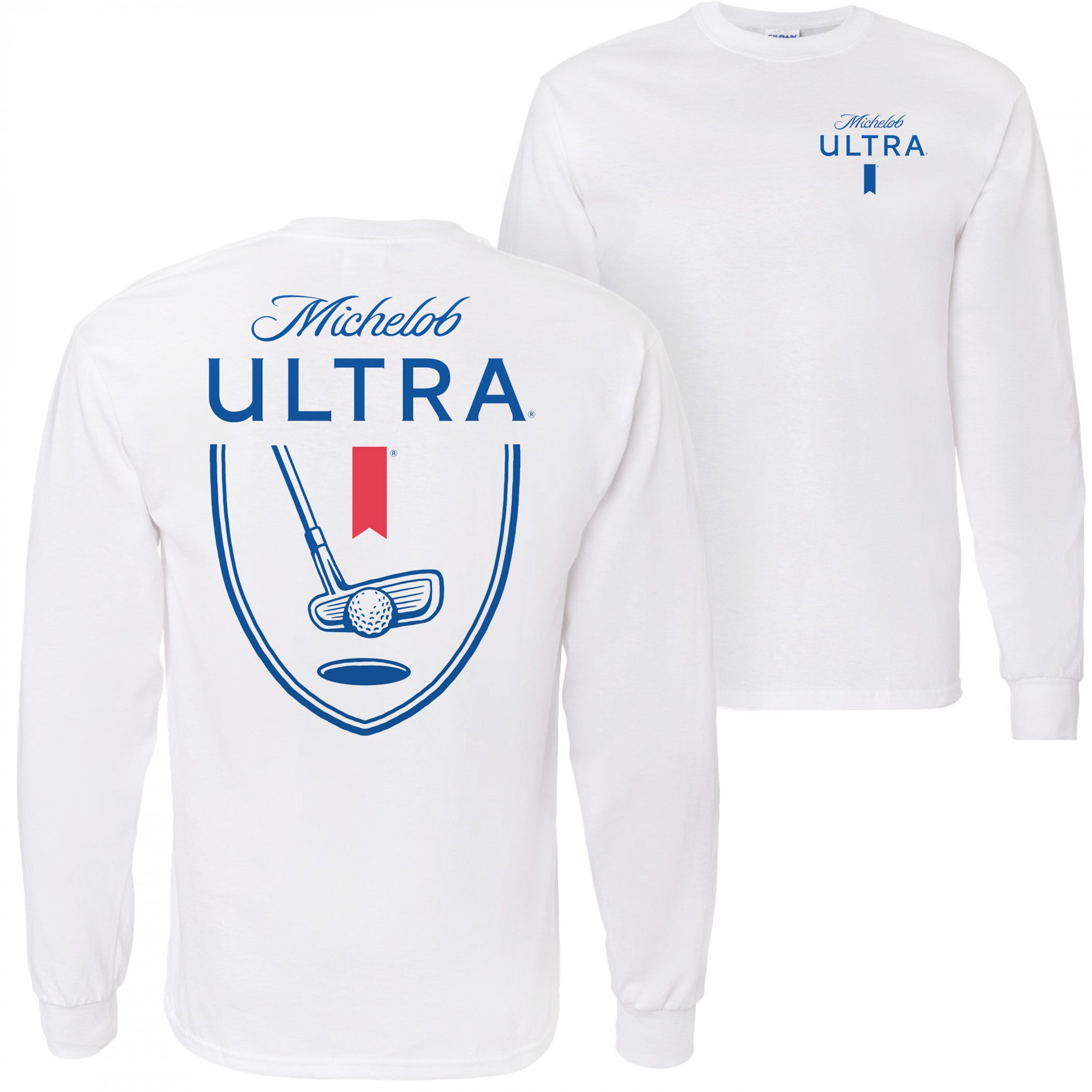 Officially licensed Michelob Ultra Golf Crest White Colorway Long Sleeve Shirt. This white "Michelob Ultra" long sleeve shirt is made from cotton and features a classic "Michelob Ultra Golf Putter" logo design printed on the front and the back.